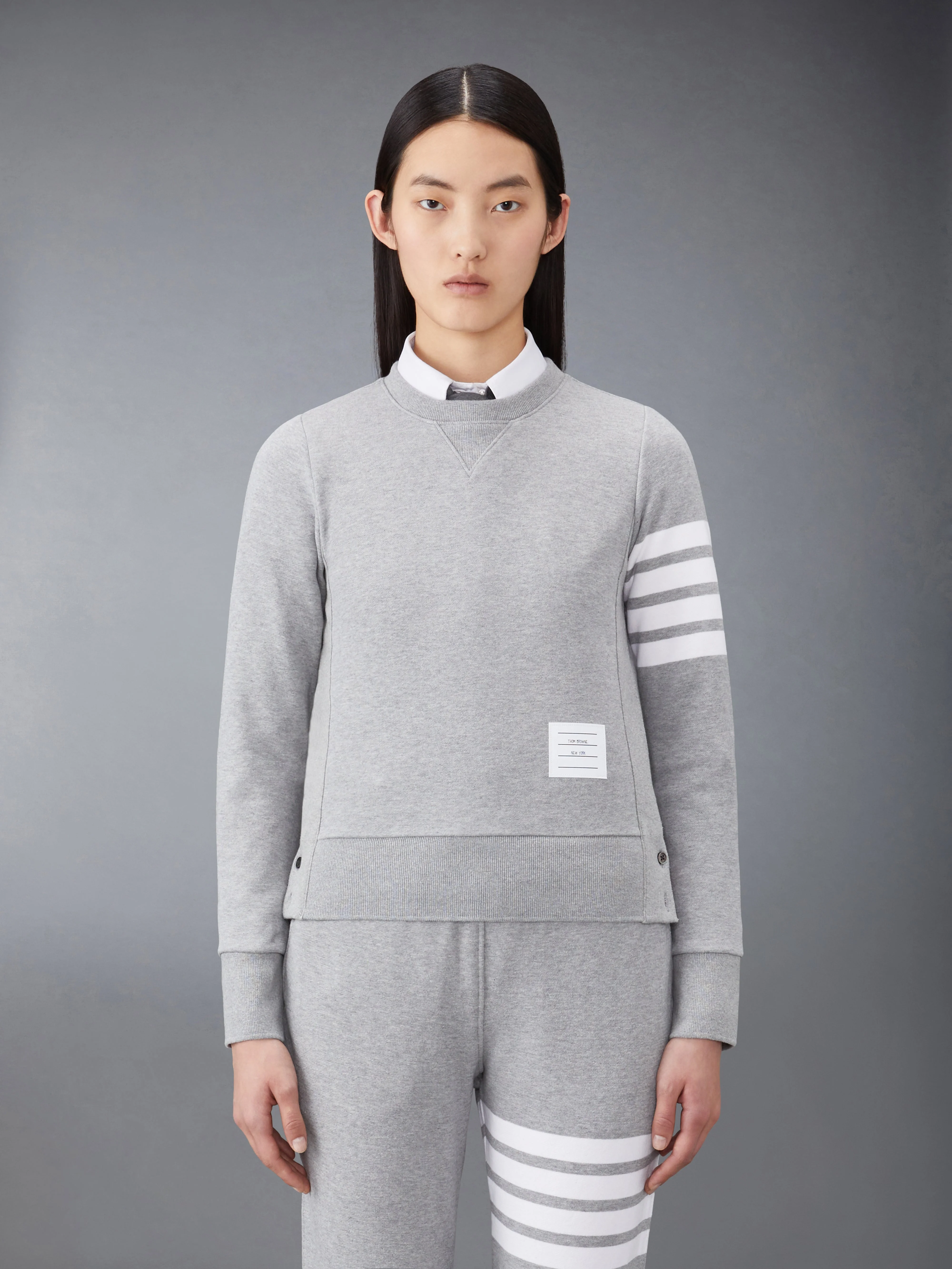 DETAILS & FIT Leisurewear made artful. Our Classic Loopback 4-Bar Sweatshirt is adorned with our iconic 4-Bar stripe detailing emulated after varsity stripes. Crew neckline with VPatch Engineered 4-bar stripe detail at left sleeve Name tag applique above hem Buttoned side vents with signature striped grosgrain trim Signature striped grosgrain loop tab at back of neck Model is 5' 10" (178cm), wearing size 40 100% Cotton Made in Japan FJT002A-00535-055 - Length: 56.0cm - WAIST: 77.0cm - BUST: 89.0cm - Shoulder Width: 35.0cm - SLEEVE LENGTH: 59.0cm