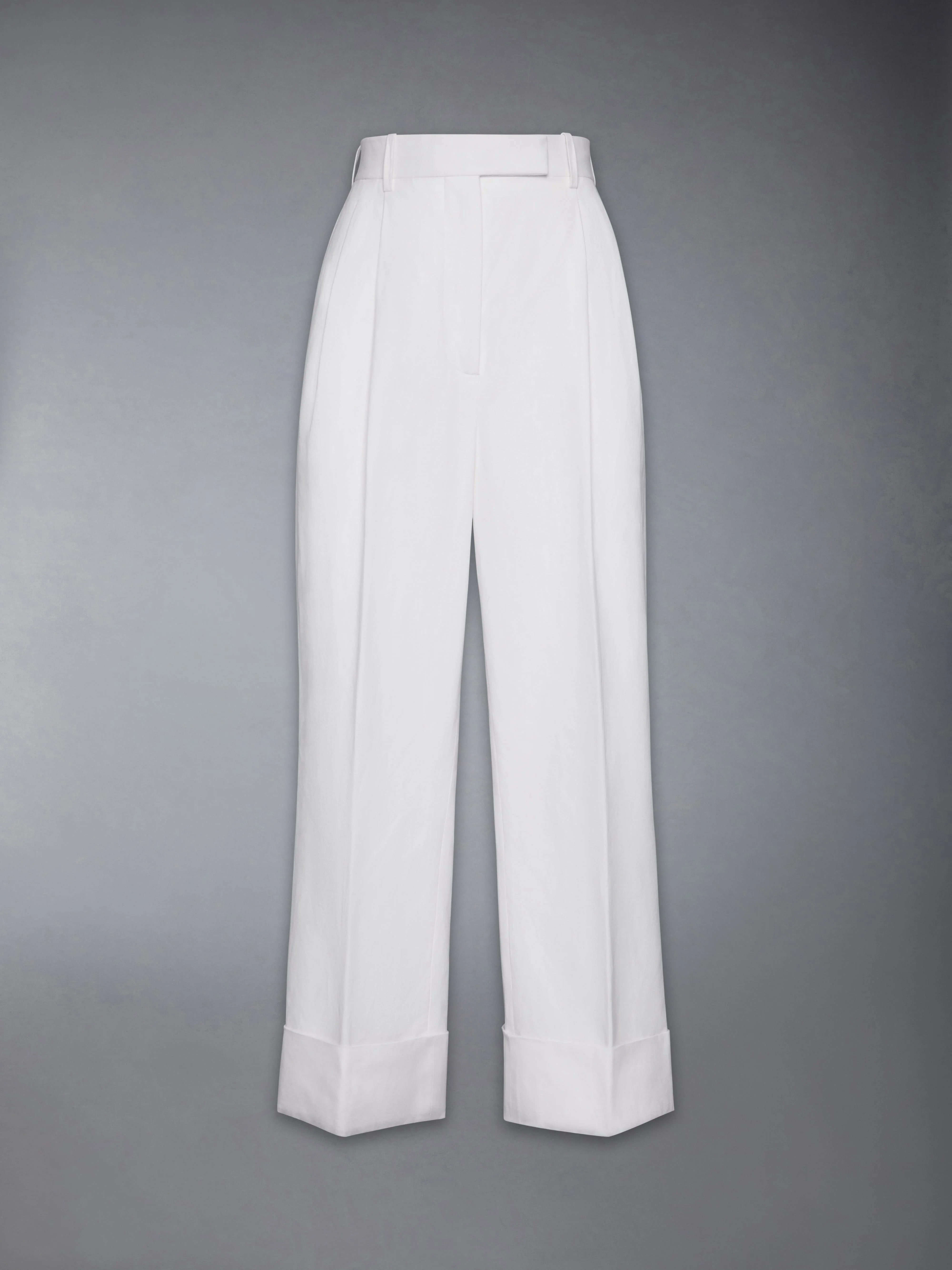 DETAILS & FIT Tailored to perfection, our Linen Cotton High Waisted Trousers will effortlessly elevate any dress shirt, sweater, or sport coat. Pair them with our Poplin Easy Fit Shirt to leave a lasting impression. Front snap button closure Grosgrain armbands Interior pocket with name tag Signature striped grosgrain loop tab Model is 5'10" (178 cm), wearing size 40 55% Cotton, 45% Linen Lining: 100% Cupro Made in Italy FTC499A-F0829-100