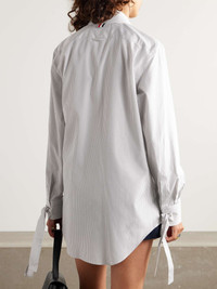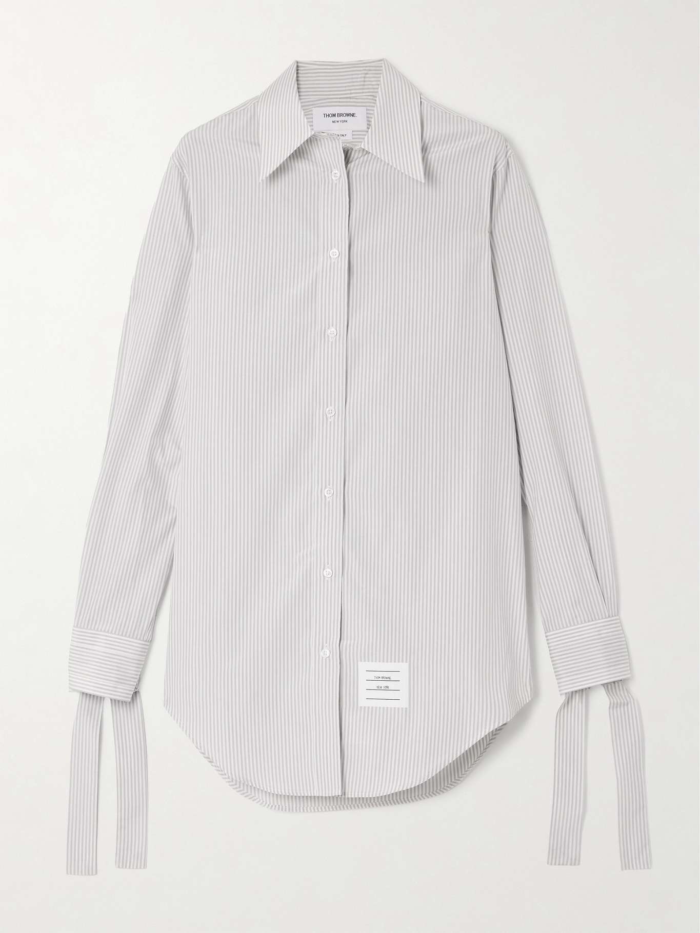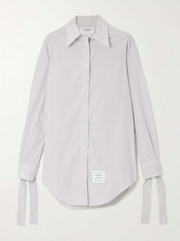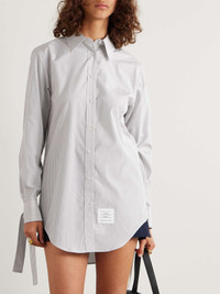 EDITORS'NOTES Thom Browne reinterprets classic tailoring in contemporary ways. Made in Italy from silk and cotton, this striped shirt dress has a bow on each cuff and a curved hem accented with a logo patch. SIZE & FIT Model measurements: - Fits true to size, take your normal size - Designed for a slightly loose fit - Lightweight, non-stretchy fabric - Model is 180cm/ 5'11" and is wearing an IT 40 - Bust: 81cm/ 32" - Waist: 63cm/ 25" - Hip: 91cm/ 36" DETAILS & CARE - Grey and ecru silk and cotton-blend - Button fastenings through front - 66% silk, 34% cotton - Dry clean - Mother-of-pearl: Indonesia