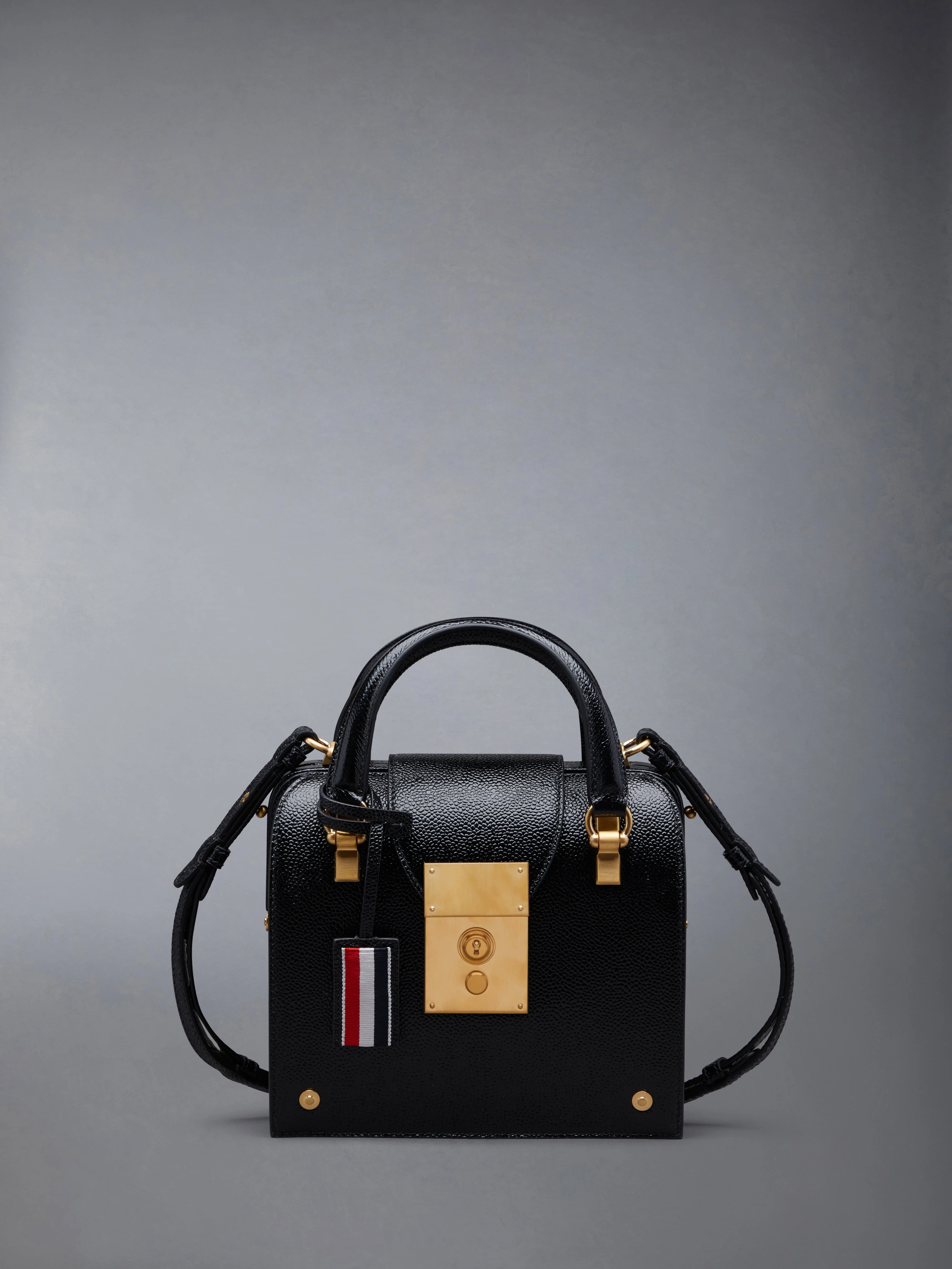 DETAILS & FIT With a minature frame and pebbled finish, our Lucido Mrs. Thom Mini Bag is an elegant take on our Mr. Thom silhouette. Brass lock closure at front Rounded leather top handles Striped leather key holder Brass rivets and feet Striped Interior Interior zip pocket and name tag Signature striped grosgrain loop tab at entry Measures W20 x H18 x D11cm 100% Calf Leather Lining: 100% Lamb Leather Lining2: 100% Polyester Made in Italy FAP060A-03542-001