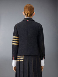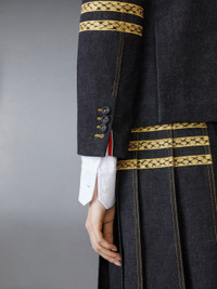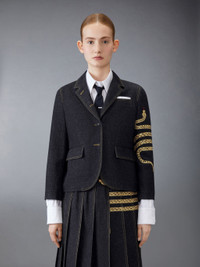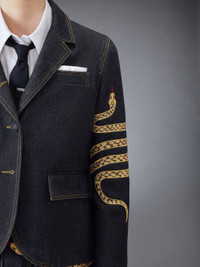 DETAILS & FIT To the Year of the Snake. Tradition meets artistry with this exquisite sport coat, adorned with a majestic, intricately embroidered golden snake that envelops you in wisdom, grace, and prosperity. Finished with elegant golden contrast trim, this piece embodies refined elegance. Ring in the New Year with style and sophistication. Complete the look with our Lunar New Year Denim Pleated Skirt. Front button closure 2 Front flap pockets Single chest pocket Double vented back Buttoned cuffs with signature striped grosgrain trim Signature striped grosgrain loop tab Model is 5'10" (178 cm), wearing size 40 100% Cotton Combo 1: 100% Polyester Combo 2: 45% Rayon, 20% Polyester, 20% Metal, 15% Paper Made in Italy FBC812E-E1184-420
