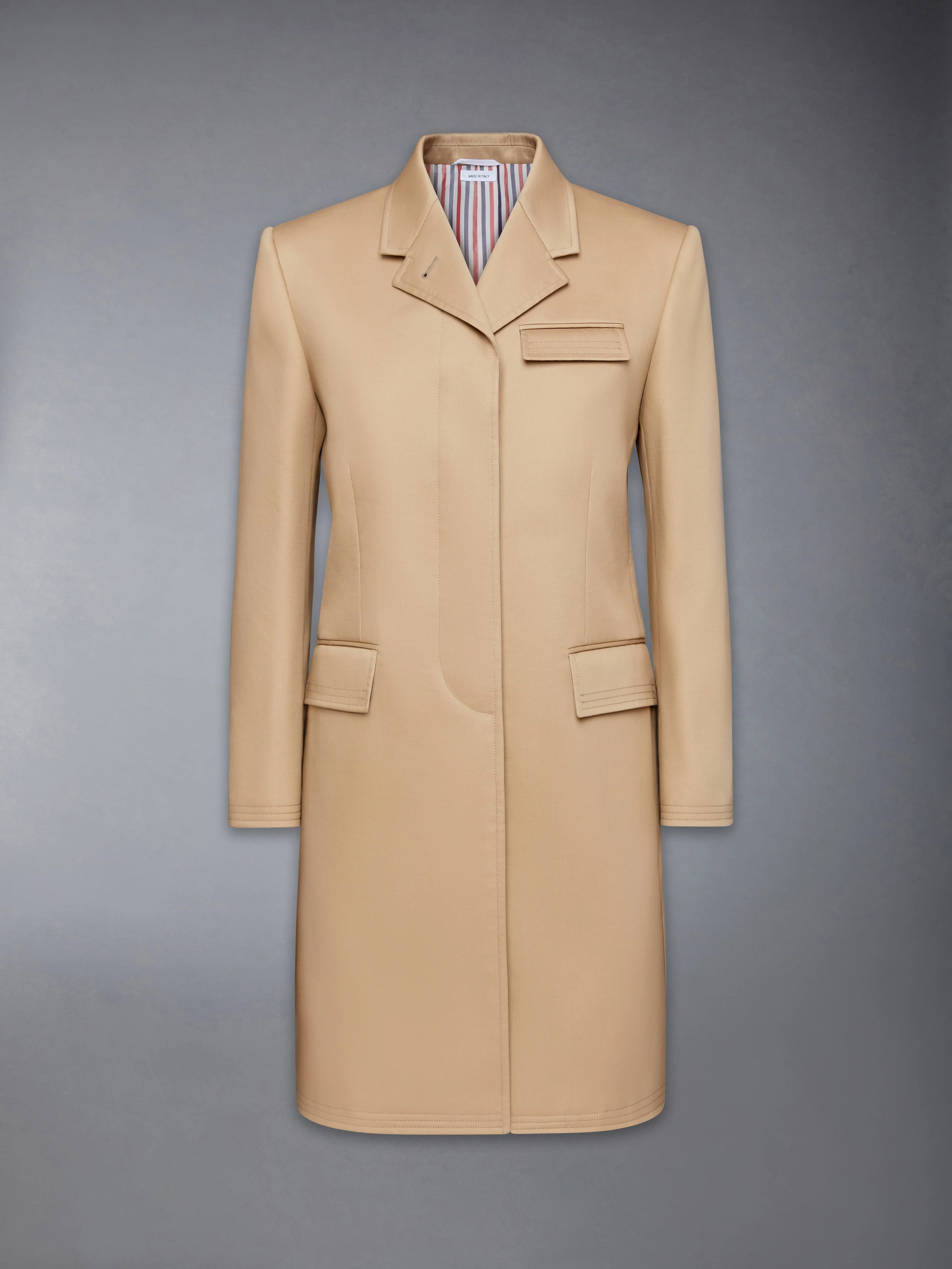 Our Mackintosh High Armhole Chesterfield Overcoat exudes Thom Browne's mastery of minimalistic design and tailored excellence. A hidden button-front closure is at center, while our iconic striped grosgrain loop tab rests at the nape of the neck. Hidden button-front Notched lapels 2 flap front pockets Single flap chest pocket Buttoned cuffs with signature striped grosgrain trim Buttoned double back vent with signature striped grosgrain trim Striped lining with interior pocket and name tag Signature striped grosgrain loop tab at back of neck High Armhole - Fit 3 Model is 5'10"" (178 cm), wearing size 40 100% Cotton Lining: 100% Cupro Made in Italy FOC300V-00249-250