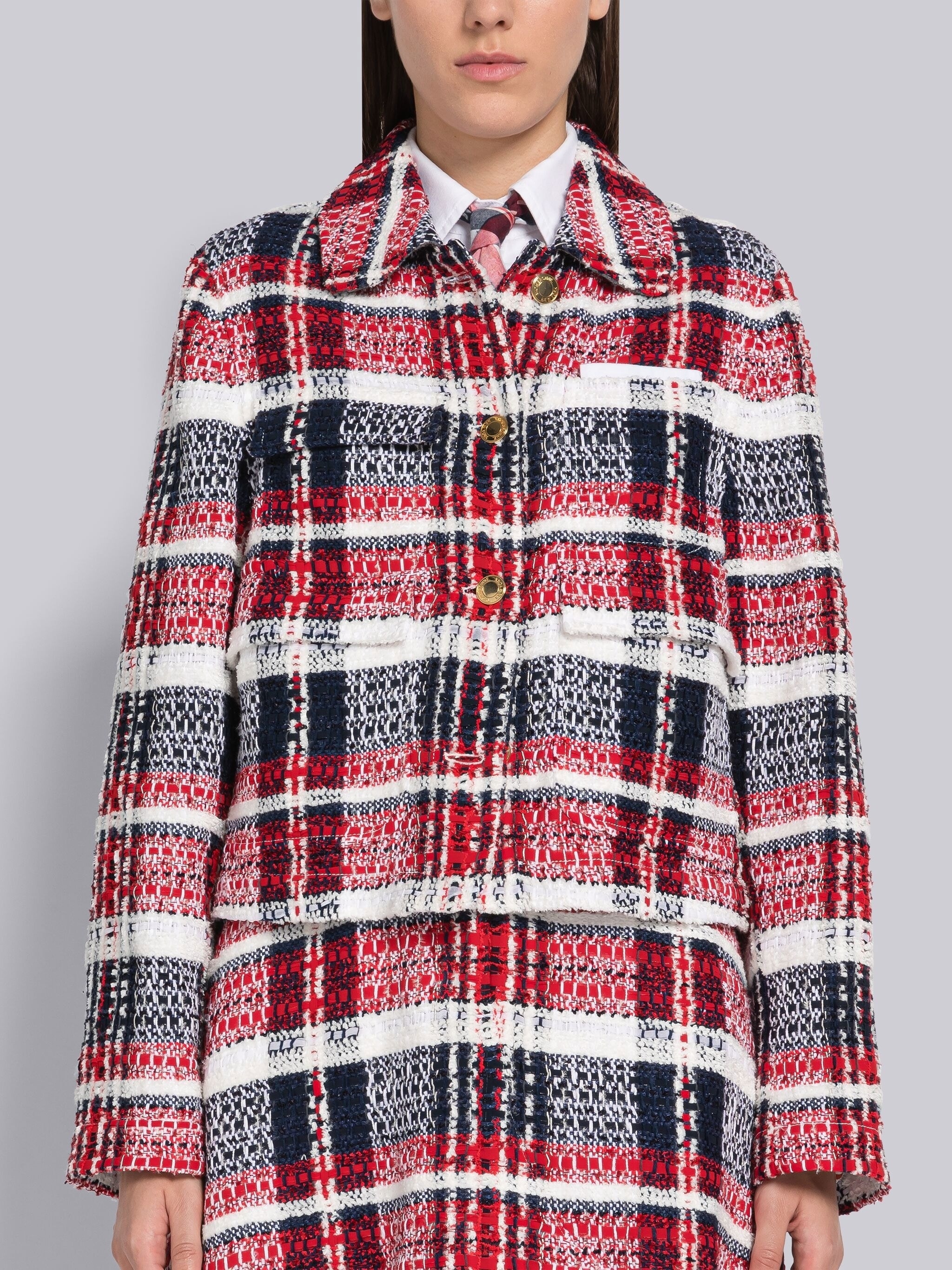 DETAILS & FIT Round collar unconstructed utility jacket in Madras check chenille tweed. Brass front button closure, 2 flap front pockets. Striped lining. Signature striped grosgrain loop tab at back of neck. Model is 5'10" (178 cm), wearing size 40 Made in Italy 33% Polyester, 24% Acrylic, 20% Cotton, 10% Polyamid, 7% Virgin Wool, 3% Silk, 3% Viscose FBC835AF0244960