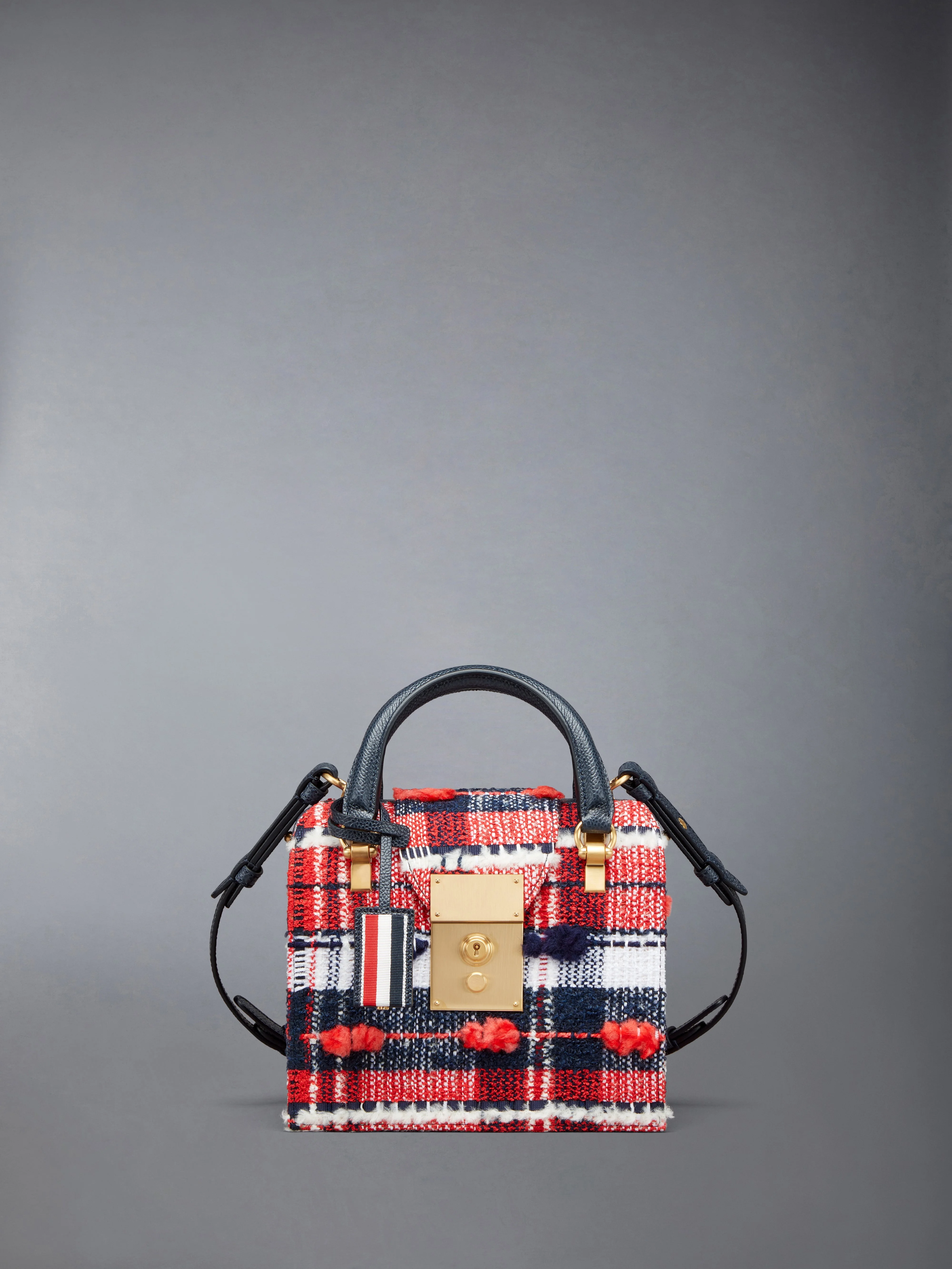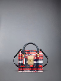 Mrs. Thom mini bag in multicolor Madras check pouf tweed. Locking brass closure at top flap, double rounded navy pebble grain leather top handles, adjustable and removable leather shoulder strap. Striped leather luggage tag. Hinged opening, striped lining with interior slip pocket. Brass hardware. Signature striped grosgrain loop tab at entry. 48% Polyester, 19% Acrylic, 10% Wool, 10% Cotton, 7% Viscose, 6% Polyamide Combo1:100% Calf Full Grain Leather Lining:100% Lamb Leather Lining2:100% Polyester Made in Italy FAP060A-F0279-960