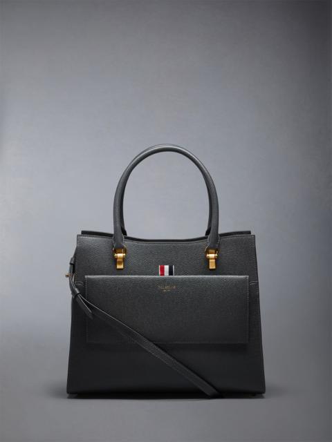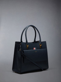 DETAILS & FIT The classic sihlouette of the Duet Bag reimagined in a smaller frame that is easier for everyday use. Double rounded leather top handles Large front folio pocket Brass hardware Gold foil printed logo and signature striped grosgrain loop tab at front pocket entry. 100% Calf Full Grain Leather Lining: 100% Polyester Made in Italy FAP239A-00198-415