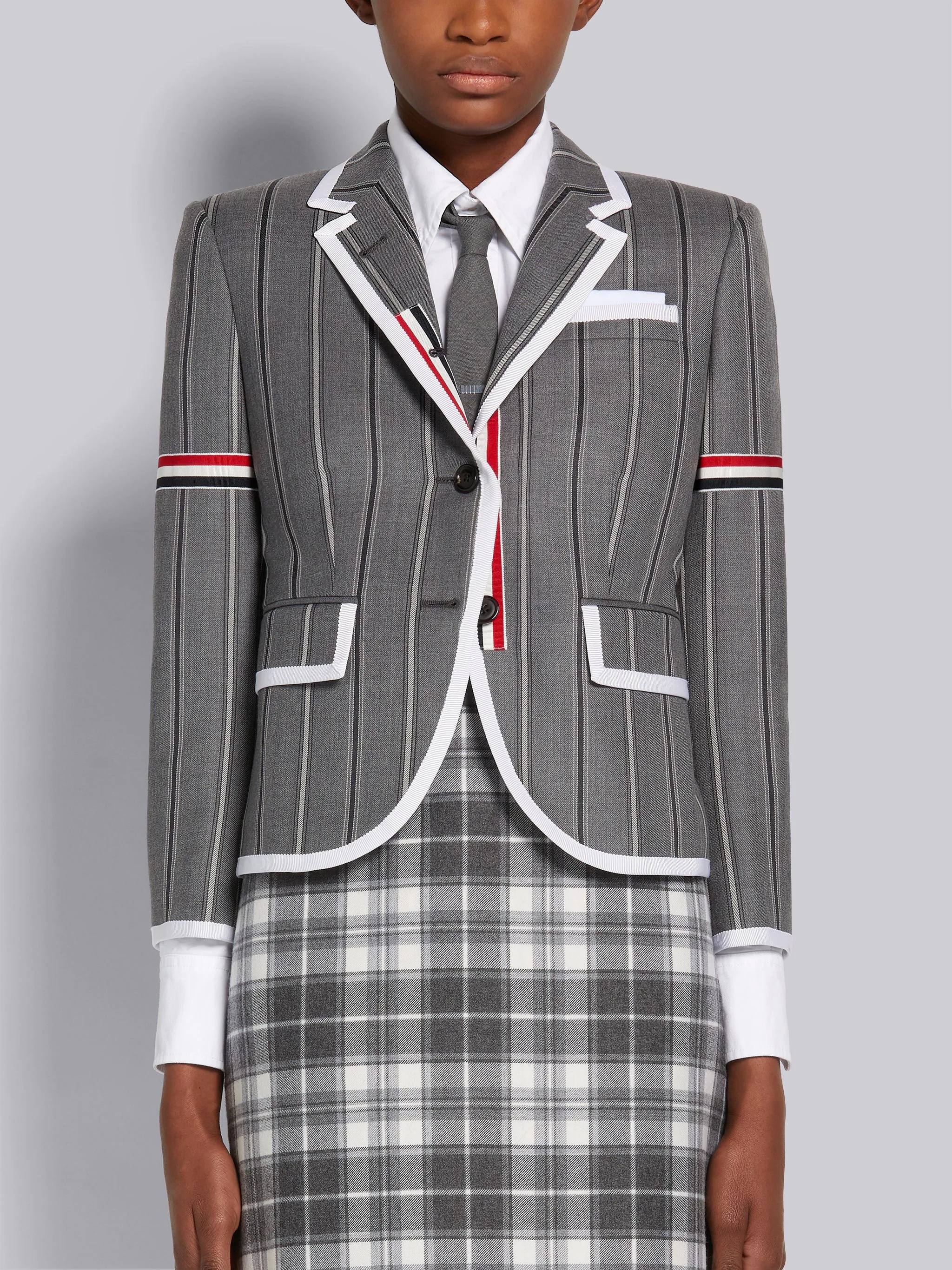 DETAILS & FIT Shrunken fit sport coat in medium grey alternating stripe wool suiting with white grosgrain tipping details and striped armbands. 2-button front closure with striped placket, notched lapels. Flap front pockets, single chest pocket. Buttoned armbands. Double vented back hem. Signature striped lining with name tag at interior pocket. Signature striped grosgrain loop tab at back of neck. High Armhole - Fit 3. Model is 5'10" (178 cm), wearing size 40 100% Wool Made in Italy FBC010M07472035