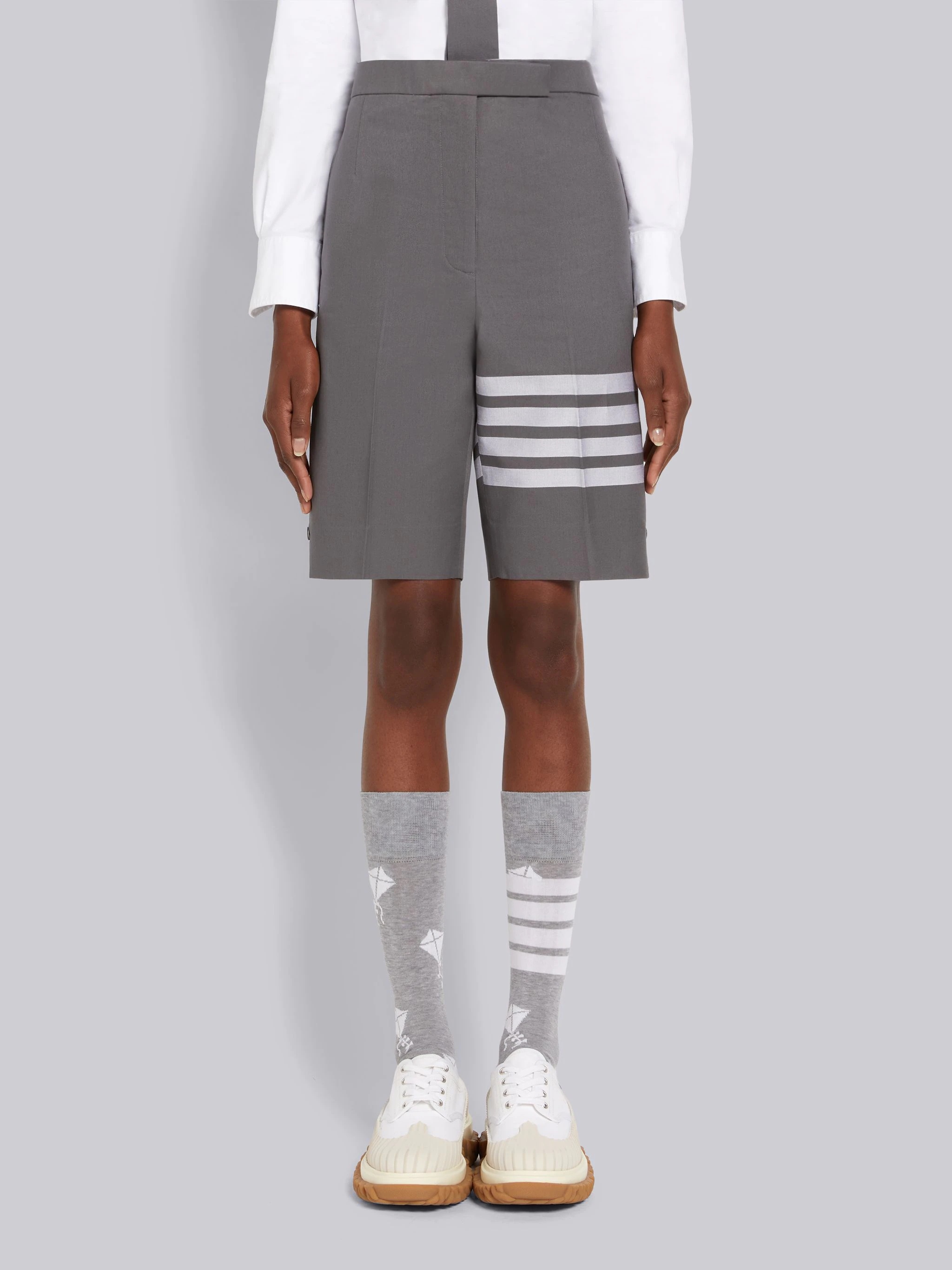 DETAILS & FIT Backstrap bermuda short in medium grey medium grey cotton twill with engineered 4-bar stripe detail at left thigh in white. Tab closure, on-seam side pockets, button back welt pockets. Adjustable buttoned backstrap. Creased legs. Signature striped grosgrain loop tab at back waist. Model is 5'10" (178 cm), wearing size 40 100% Cotton Made in Italy FTC404U07890035