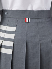 DETAILS & FIT Inspired by East Coast preppy icons but reimagined with inventive proportions and quality craftsmanship, our Plain Weave 4-Bar Thigh Length Dropped Back Pleated Skirt is a fresh take on a traditional silhouette. Pair with our leather brogue heels. Engineered 4-bar stripe detail Dropped back hem with signature striped grosgrain trim Adjustable Buttoned side tab closure Signature striped grosgrain loop tab at back waist Model is 5' 10" (178cm), wearing size 40 100% Wool Lining: 100% Cupro Made in Italy FGC402V-06146-035