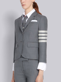 DETAILS & FIT High armhole single-breasted jacket in medium grey plain weave suiting with engineered 4-bar stripe detail at left sleeve in white. Brass button closure, 2 flap pockets, single chest pocket. Interior name tag. Signature striped grosgrain loop tab at back of neck. High Armhole - Fit 3. / Model is 5'10" (178 cm), wearing size 40 / 100% Wool Made in Italy FBC010A06146035