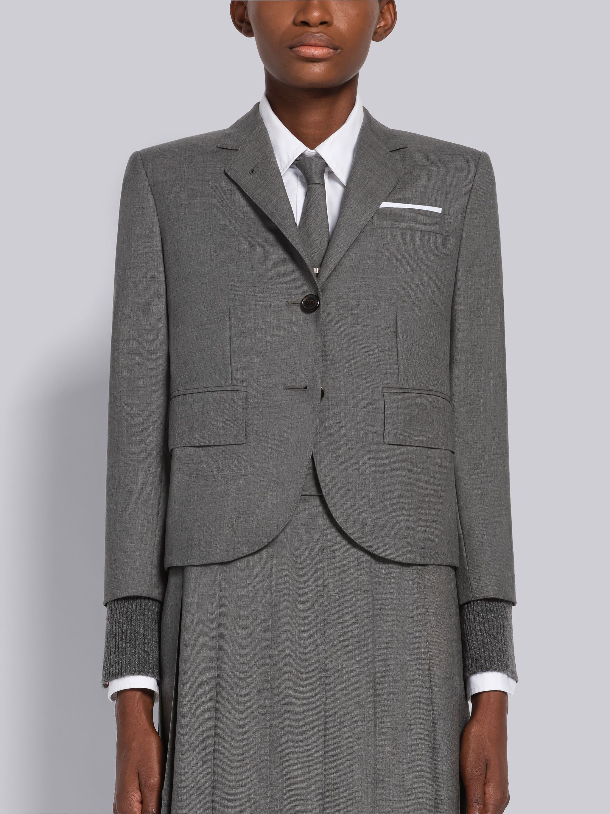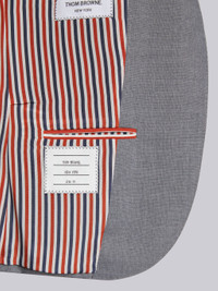 DETAILS & FIT Our Twill Slim Fit Sport Coat embraces a slimmer fit taken from punk influences while remaining true to Thom Browne’s classic heritage. Front button closure Notched lapels 2 flap front pockets Single chest pocket Buttoned cuffs with signature striped grosgrain trim Double back vent Striped lining with interior pocket and name tag Signature striped grosgrain loop tab at back of neck High ArmholeFit 3 Model is 5' 10" (178cm), wearing size 40 100% Wool Lining: 100% Cupro Made in Italy FBC010V-00626-035