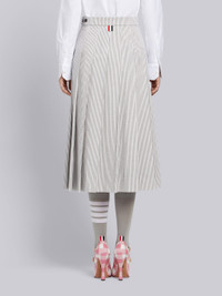 DETAILS & FIT Below-the-knee pleated skirt in medium grey striped seersucker with dropped back. Signature grosgrain trim at stepped hem. Signature striped grosgrain loop tab at back waist. Model is 5'10" (178 cm), wearing size 40 100% Cotton 100% Silk Lining Made in Italy FGC400A00572035