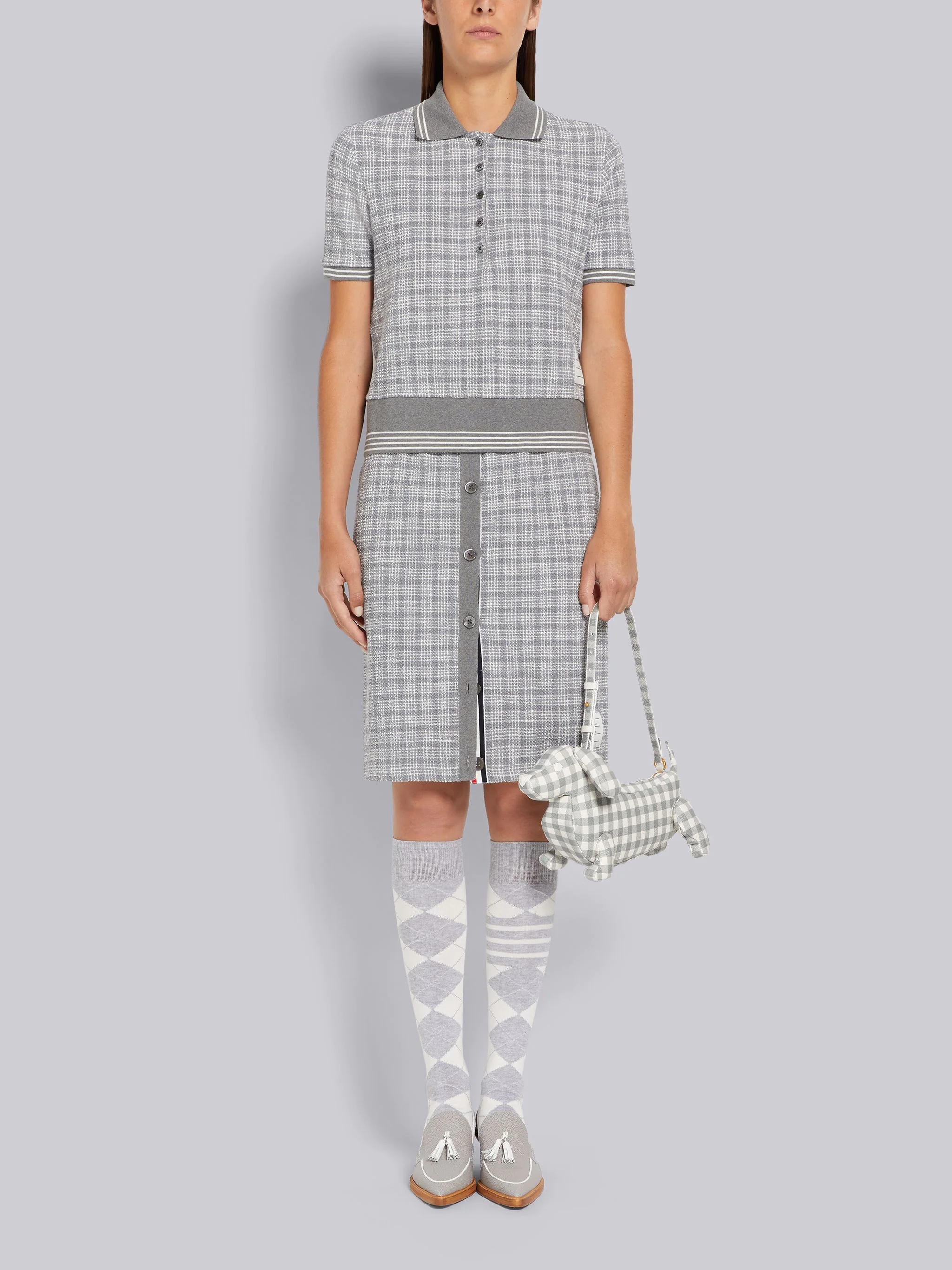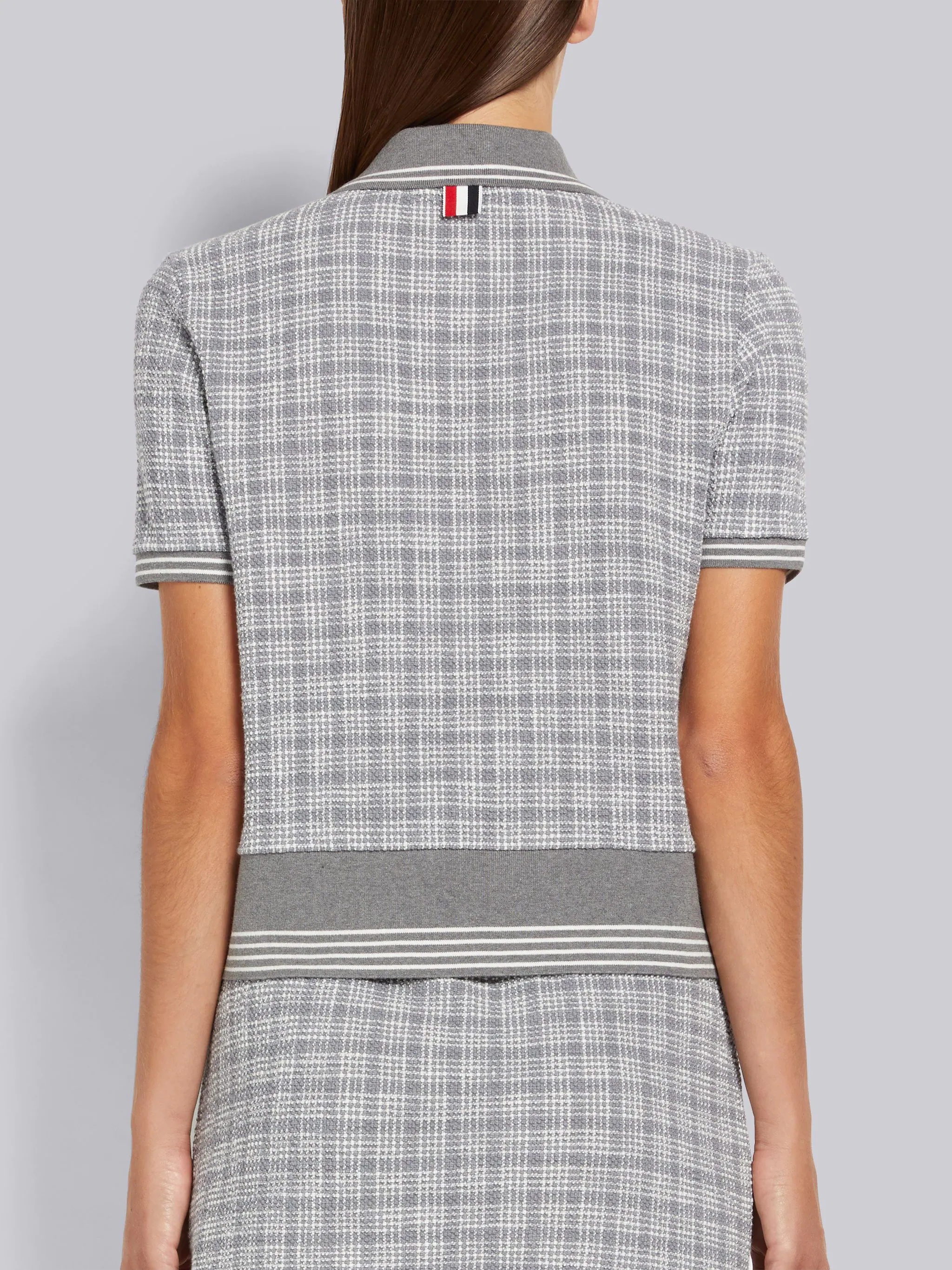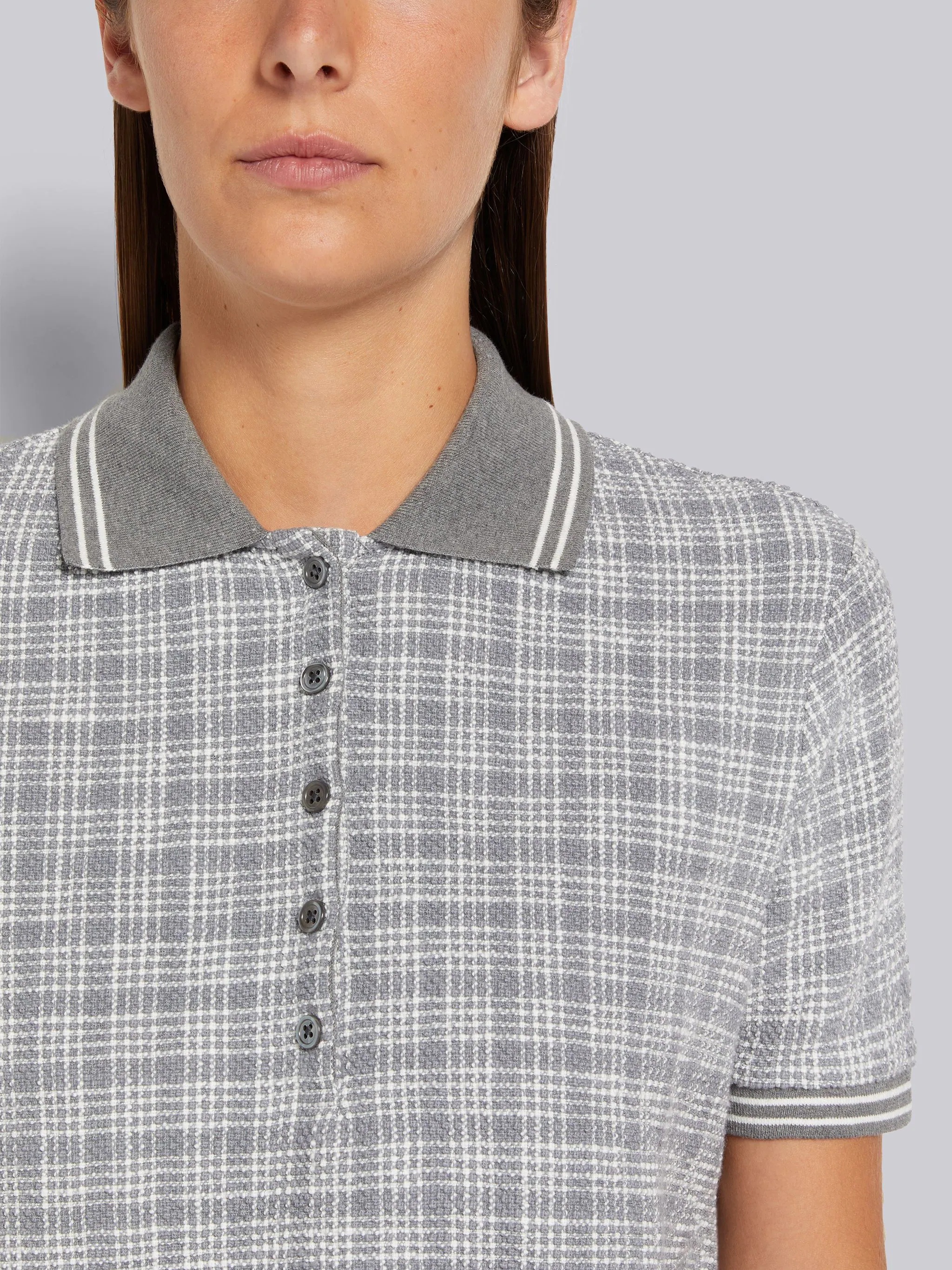 DETAILS & FIT Short sleeve polo in medium grey textured micro 4-bar check cotton tweed. Partial button placket, spread collar, name tag above hem. Ribbed trim with stripe detail above hem. Signature striped grosgrain loop tab at back of neck. Model is 5'10" (178 cm), wearing size 40 100% Cotton Made in Italy FJP059A08083035