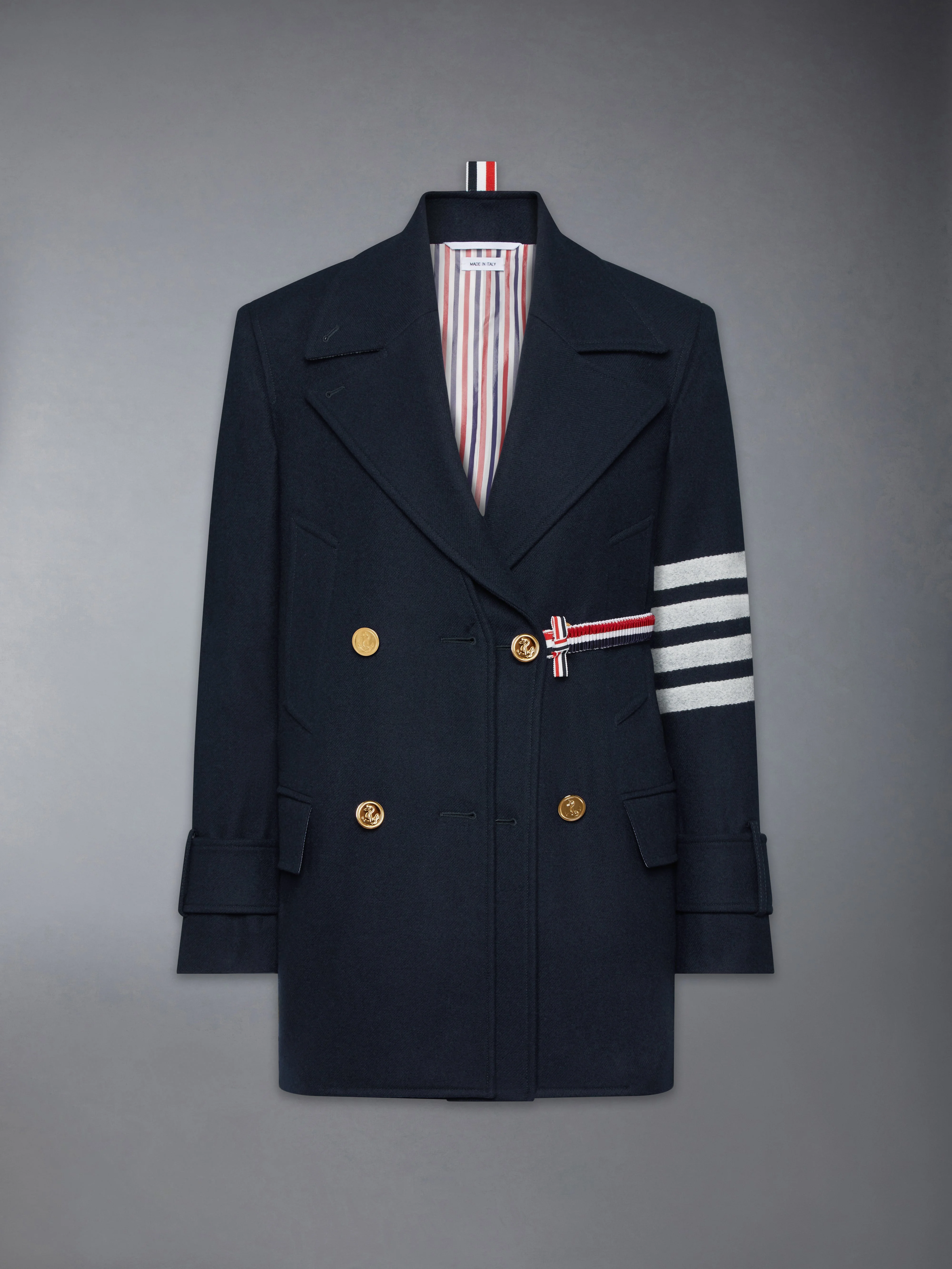 Crafted for durability and cold weather, this heavy-felted jacket embodies signature Thom Browne tailoring with narrow shoulders. Refined gold buttons embossed with the Thom Browne insignia add a touch of elegance, while our iconic 4-bar stripes provide a distinct finishing touch. Designed with a double-layered construction, the inner layer functions as a standalone vest, offering a versatile 2-in-1 design that adapts effortlessly to shifting temperatures. Withstand the elements in true Thom Browne style. Double breasted front button closure with striped grosgrain bow 4-bar detailing Interior pocket with name tag Signature striped grosgrain loop tab Model is 5'10" (178 cm), wearing size 40 95% Wool, 5% Cashmere Lining: 100% Cupro Made in Italy FOC888A-F0522-415