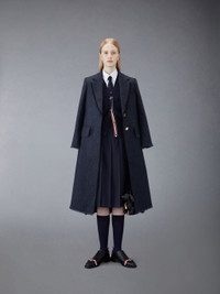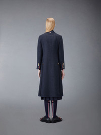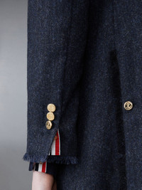 DETAILS & FIT Our Donegal Tweed Wide Lapel Overcoatexudes Thom Browne's mastery of minimalistic design and tailored excellence. A single button-front closure is at center, while an iconic striped grosgrain loop tab rests at the nape of the neck. Front button closure 2 front flap pockets Notched lapels Buttoned cuffs with signature striped grosgrain trim Double vented back with grosgrain trim Model is 5' 10" (178cm), wearing size 40 100%Wool Made in Italy FOC320W-05385-415