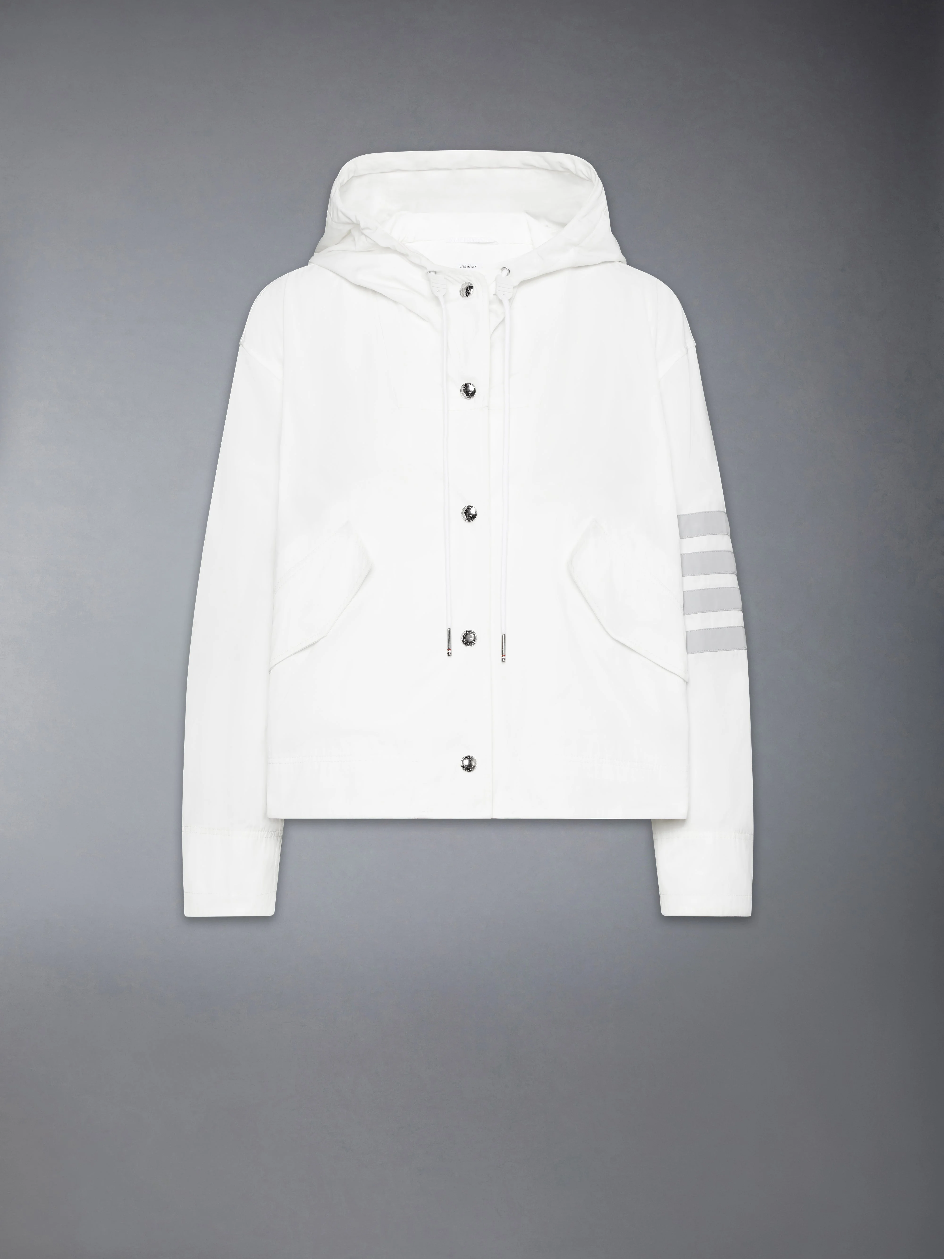 Stay protected from inclement weather with this luxurious anorak, crafted for both style and functionality. Made from memory tech fabric it offers the perfect balance of comfort and durability. Front snap button closure 2 Front flap pockets 4-bar detailing Model is 5'10" (178 cm), wearing size 40 100% Polyester Made in Italy FOC885C-F0956-100 FOC885C-F0956-100