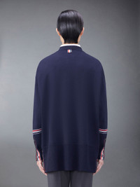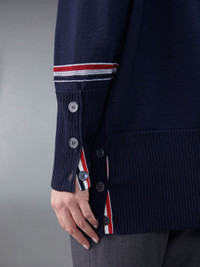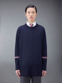 DETAILS & FIT Exaggerated crew neck pullover in navy Merino wool with stripe jacquard details above wrists. Ribbed cuffs and hem. Buttoned side vents and cuffs with signature striped grosgrain trim. Signature striped grosgrain loop tab at back of neck. Model is 5'10" (178 cm), wearing size 40 100% Virgin Wool Made in Italy FKA424AY1002415