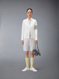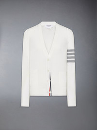 Two Thom Browne emblems define our Wool 4-Bar V-neck Cardigan ー grosgrain trim and 4-Bar stripe detailing, both synonymous with the brand. Presented in fine virgin merino wool fabric, this roomy cardigan exudes sophistication. V-neck Front button closure with striped grosgrain placket 4-bar stripe detailing Buttoned side vents and cuffs with signature striped grosgrain trim Signature striped grosgrain loop tab at back of neck Model is 5' 10" (178cm), wearing size 40 100% Virgin Wool Made in Italy FKC334A-Y1014-100