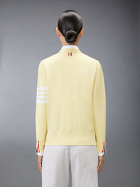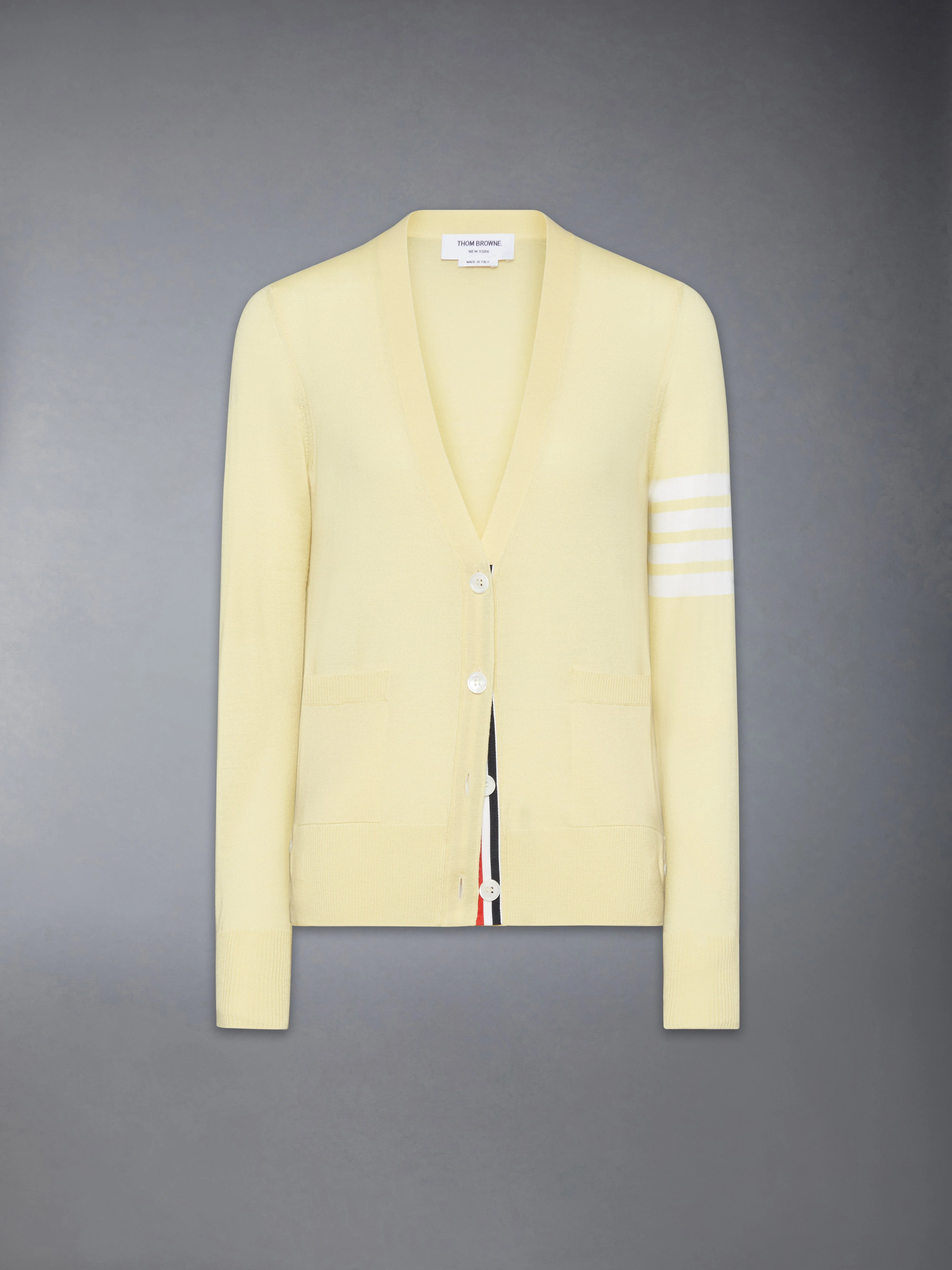 Two Thom Browne emblems define our Wool 4-Bar V-neck Cardigan ー grosgrain trim and 4-Bar stripe detailing, both synonymous with the brand. Presented in fine virgin merino wool fabric, this roomy cardigan exudes sophistication. V-neck Front button closure with striped grosgrain placket 4-bar stripe detailing Buttoned side vents and cuffs with signature striped grosgrain trim Signature striped grosgrain loop tab at back of neck Model is 5' 10" (178cm), wearing size 40 100% Virgin Wool Made in Italy FKC334A-Y1014-740