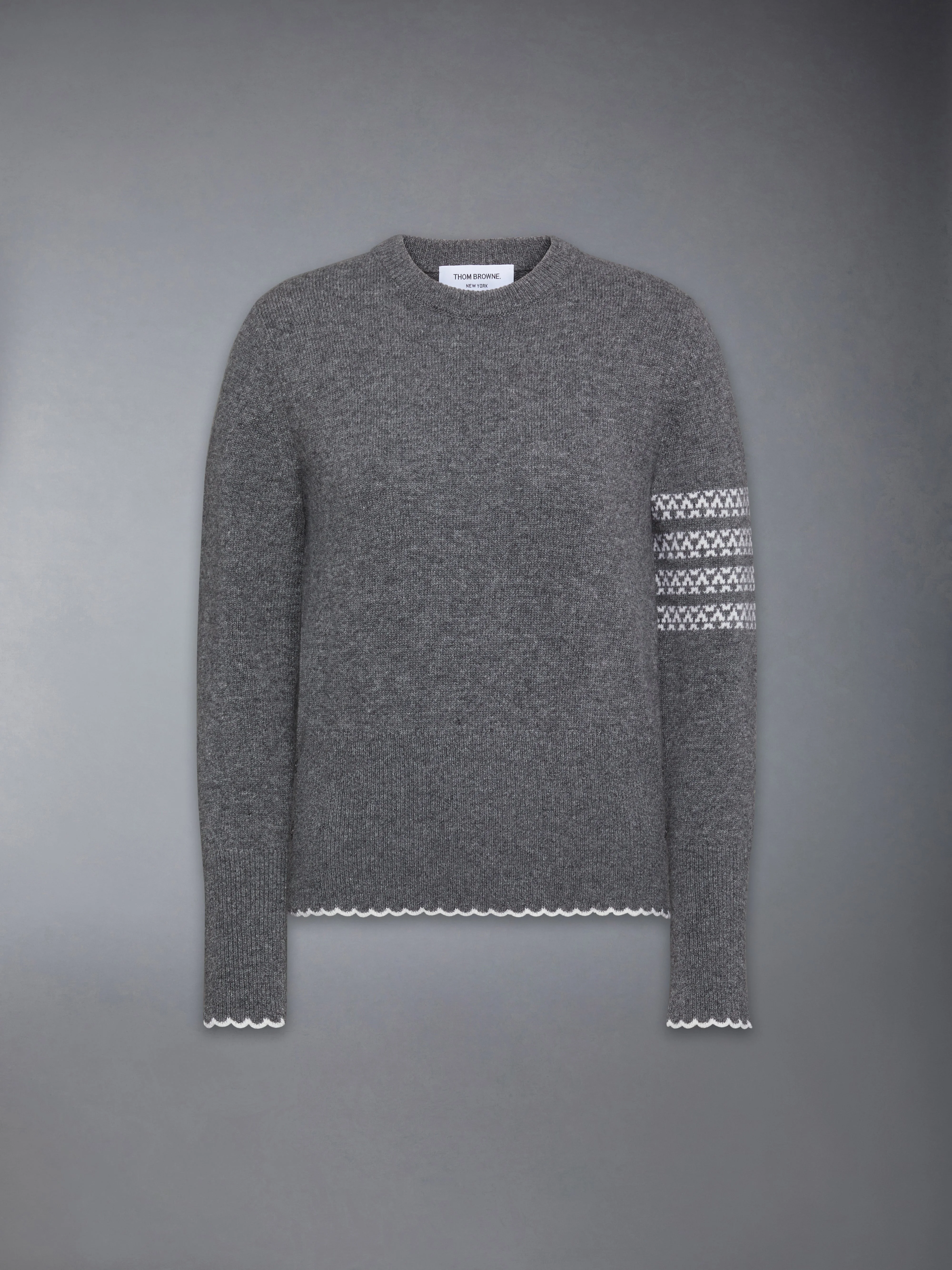 Whimsy meets tradition in this seasonal crewneck, knit in soft merino wool. A Fair Isle–inspired take on the signature 4-bar motif is paired with a matching intarsia of Hector, marking ten years as Thom Browne icon. These playful patterns bring festive charm to a timeless silhouette, finished with delicate scalloped cuffs. Ribbed neckline Ribbed buttoned cuffs with scalloped trim and RWB grosgrain trim Side vents with RWB grosgrain trim Ribbed hem Fair Isle–inspired 4-bar and Hector intarsia Signature striped grosgrain loop tab Classic fit Model is 5'10" (178 cm), wearing size 40 100% Virgin Wool Made in Italy FKA514A-Y1029-035