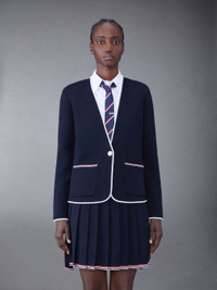 DETAILS & FIT Collarless jacket in double face Merino wool with contrast tipping in white grosgrain. Single white button closure, 2 patch front pockets with striped entry. Signature striped grosgrain loop tab at back of neck. Model is 5'10" (178 cm), wearing size 40 99% Virgin Wool, 1% Polyamide Made in Italy FKJ083AY1002415