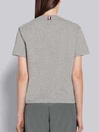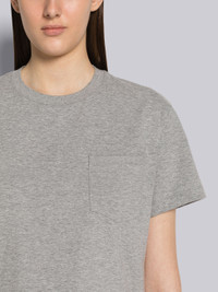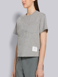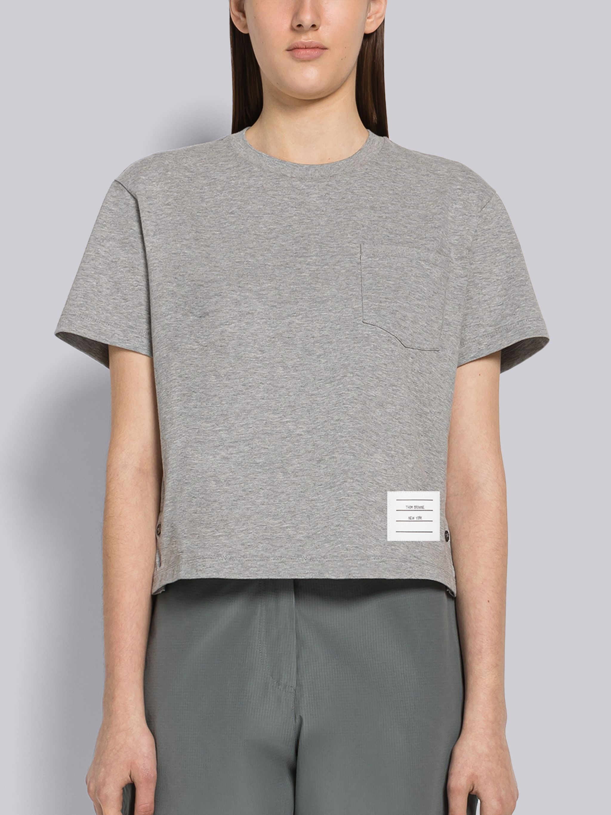 DETAILS & FIT Boxy short sleeve pocket tee in light grey midweight jersey. Crew neckline, name tag applique above hem, buttoned side vents with signature striped grosgrain trim. Signature striped grosgrain loop tab at back of neck. Model is 5'10" (178 cm), wearing size 40 100% Cotton Made in Japan FJS123A00042055