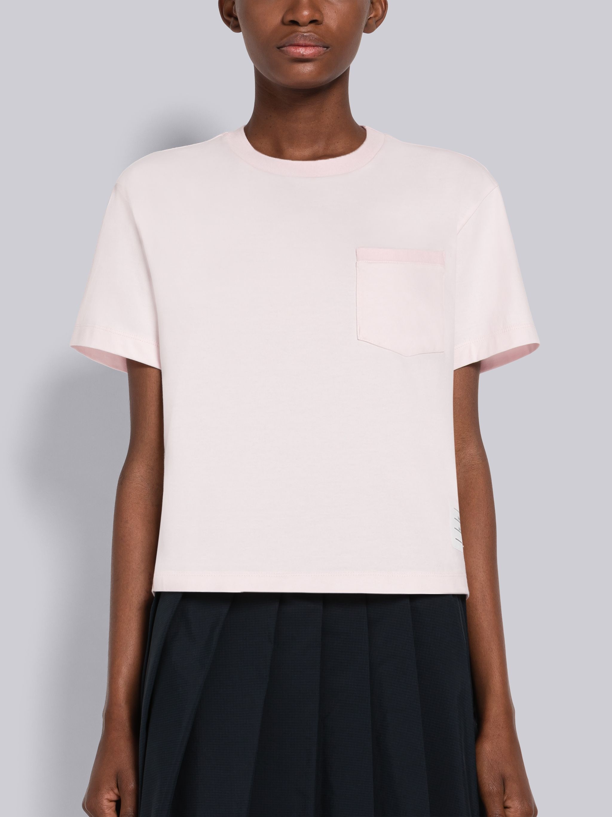 DETAILS & FIT Boxy short sleeve pocket tee in light pink midweight jersey. Crew neckline, name tag applique above hem, buttoned side vents with signature striped grosgrain trim. Signature striped grosgrain loop tab at back of neck. Model is 5'10" (178 cm), wearing size 40 100% Cotton Made in Japan FJS123A00042680