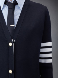 DETAILS & FIT Adorned with our signature brass buttons and 4-Bar detailing, our Wool Long V-neck Cardigan exudes sophistication. Wear in place of an overcoat on warmer days, or as an added layer during colder months. Brass front button closure Front button closure with striped grosgrain placket 4-bar stripe detail at left sleeve 2 button-fastening front slip pockets Buttoned side vents and cuffs with signature striped grosgrain trim Signature striped grosgrain loop tab at back of neck Model is 5' 10" (178cm), wearing size 40 100% Virgin Wool Made in Italy FKC289A-00014-415