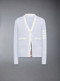 Knit in structured Milano stitch cotton, this V-neck cardigan draws on uniform codes reinterpreted through a streamlined silhouette. Clean lines and a compact hand give the piece a polished finish, while 4-bar detailing introduces bold contrast. Pair with the Cotton Typewriter Pleated Skirt for a softened take on the collegiate look. V-neckline Front button closure with RWB grosgrain placket Welt hand pockets with contrast trim Ribbed buttoned cuffs with RWB grosgrain trim Buttoned side vents with RWB grosgrain trim Ribbed hem 4-bar detailing Signature striped grosgrain loop tab Model is 5'10" (178 cm), wearing size 58 100% Cotton Made in Italy FKC207B-00219-050