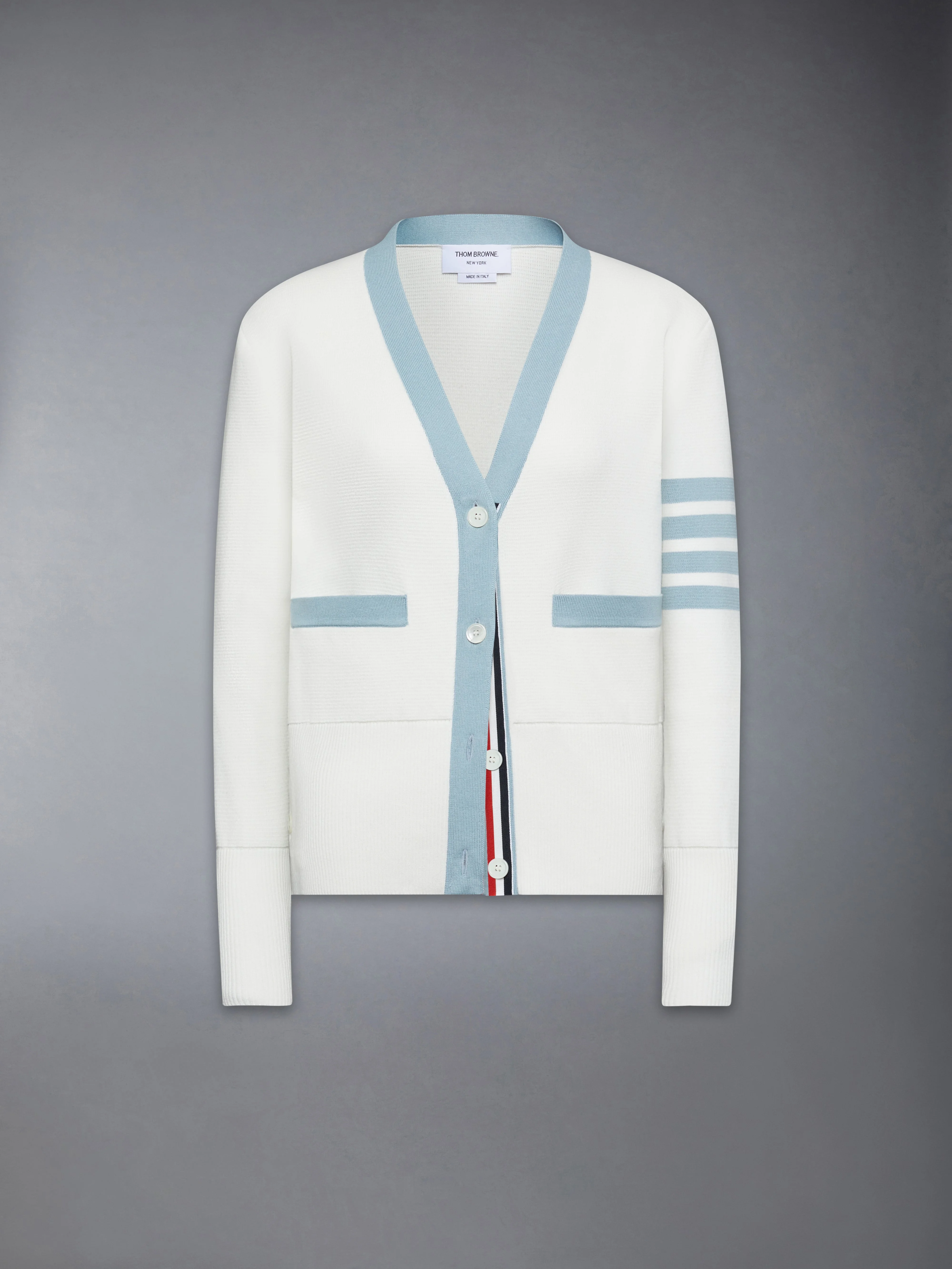 Knit in structured Milano stitch cotton, this V-neck cardigan draws on uniform codes reinterpreted through a streamlined silhouette. Clean lines and a compact hand give the piece a polished finish, while 4-bar detailing introduces bold contrast. Pair with the Cotton Typewriter Pleated Skirt for a softened take on the collegiate look. V-neckline Front button closure with RWB grosgrain placket Welt hand pockets with contrast trim Ribbed buttoned cuffs with RWB grosgrain trim Buttoned side vents with RWB grosgrain trim Ribbed hem 4-bar detailing Signature striped grosgrain loop tab Model is 5'10" (178 cm), wearing size 56 100% Cotton Made in Italy FKC207B-00219-117