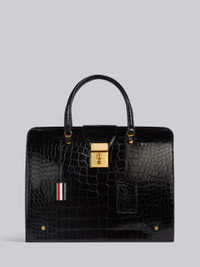 DETAILS & FIT Black Structured Mr. Thom Bag Shiny Alligator Leather Leather Handles Brass Hardware Lock Closure Internal Zip Pocket Tricolor Stripe Lining Thom Browne Luggage Tag Signature Grosgrain Loop Tab Signature Grosgrain-lined Key Pocket 16.9" x 12" x 8" NOTES 100% Alligator Leather Made in Italy MAG001L00204001 - WIDTH: 42.0cm - HEIGHT: 32.0cm - HANDLE: 17.0cm - DEPTH: 18.0cm