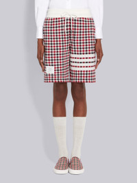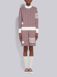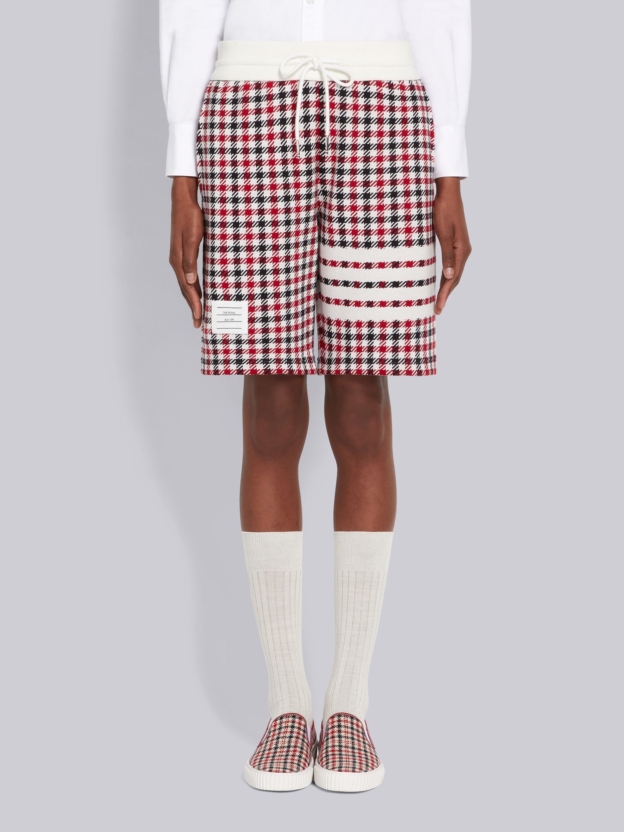 DETAILS & FIT Mid-thigh drawstring shorts in multicolor cotton gunclub check jacquard with engineered 4-bar stripe detail at left thigh in white. Ribbed waistband with tonal drawstring and metal-tipped cord. Slant side pockets. Name tag above right cuff. Signature striped grosgrain loop tab at back waist. Model is 5'10" (178 cm), wearing size 40 100% Cotton Made in Italy FJQ062A07671960