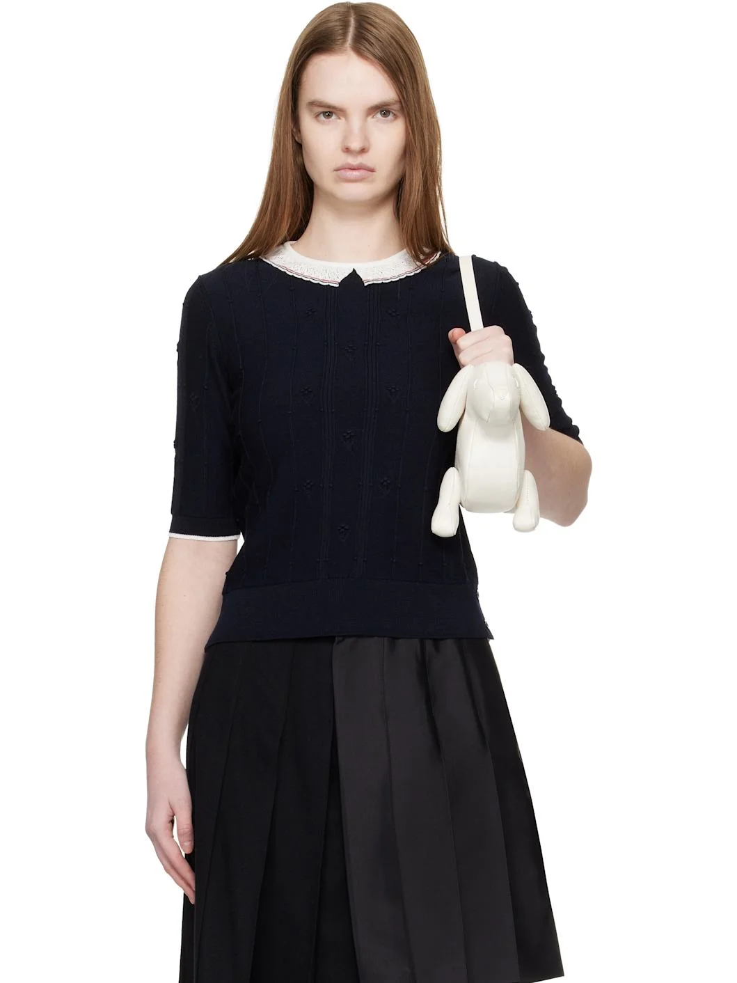 Knit virgin wool- and cotton-blend sweater. · Floral detailing throughout · Lace trim with stripes at crewneck · Rib-knit hem and cuffs · Button vent at sides · Stripe at cuffs · Tricolor flag at back collar Supplier color: Navy 95% virgin wool, 5% cotton. Made in Italy 261381F096001