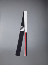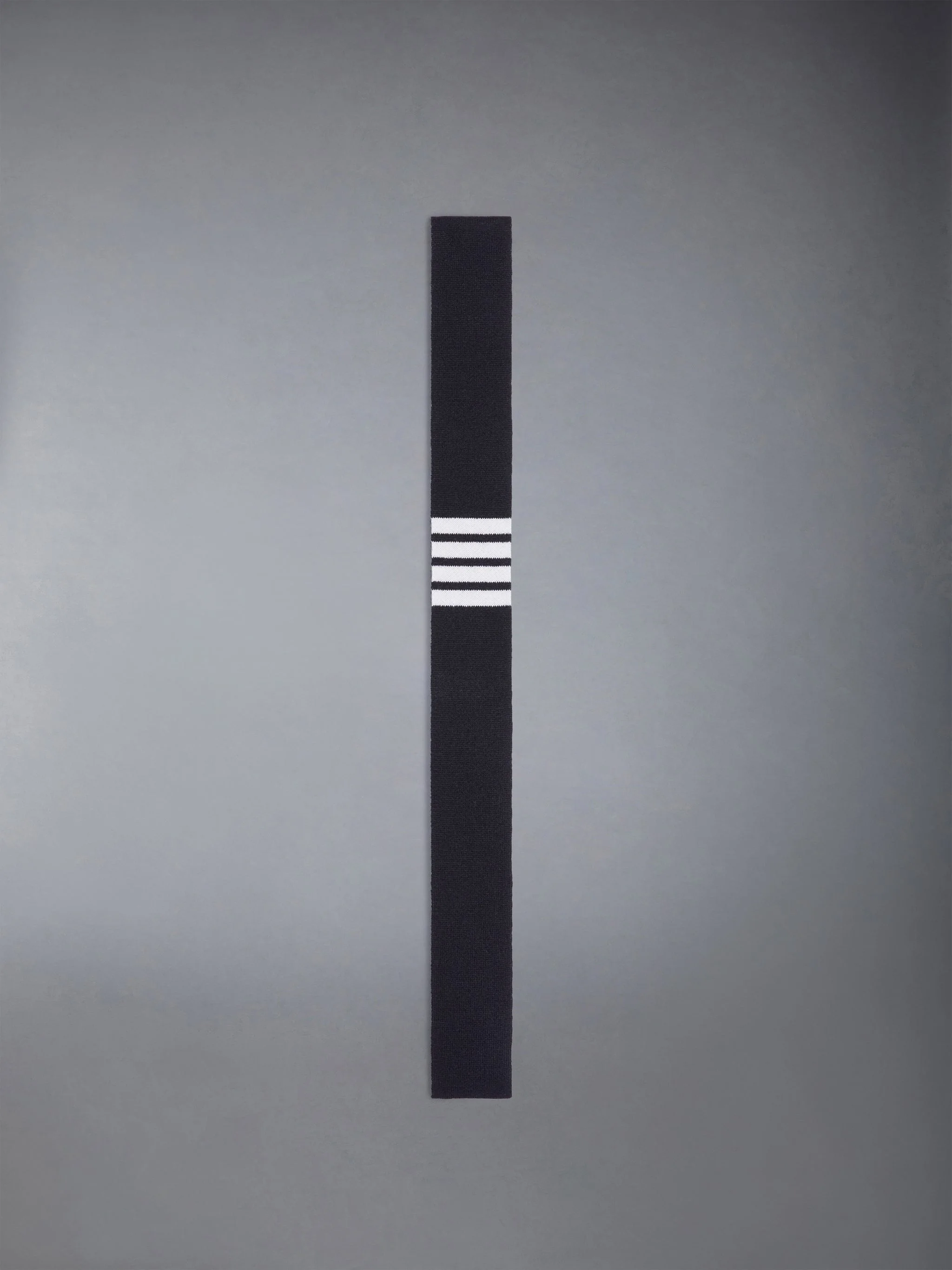 Our Cashmere 4-Bar Stripe Knit Tie is the perfect finishing touch to any Thom Browne suit. Contrasting 4-bar stripe Striped grosgrain at Interior Name tag applique at Interior 100% Cashmere Made in Italy MNL029K-00011-415