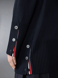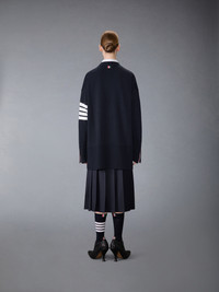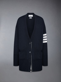 A luxurious cardigan, perfectly oversized for a comfy-chic look. Adorned with our iconic 4-bar stripes—originally inspired by mid-century collegiate and sports uniforms—this garment symbolizes discipline, achievement, and tenacity—values at the heart of Thom Browne. Front button closure with striped grosgrain placket 2 Front slip pockets 4-bar detailing Buttoned cuffs with signature striped grosgrain trim Buttoned side vents with signature striped grosgrain trim Signature striped grosgrain loop tab Model is 5'10" (178 cm), wearing size 40 100% Fine Merino Wool Made in Italy FKC402A-Y1002-415