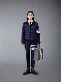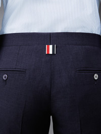 DETAILS & FIT Our Plain Weave 4-Bar Low Rise Skinny Trouser. The classic shortened hem pays homage to Thom Browne's distinguished tailoring. Tab front closure Adjustable buttoned backstrap 4-bar stripe detail Slip side pockets Button-fastening jetted hip pockets Signature striped grosgrain loop tab at back waist Model is 5' 10" (178cm), wearing size 40 100% Wool Made in Italy FTC025V-06146-415