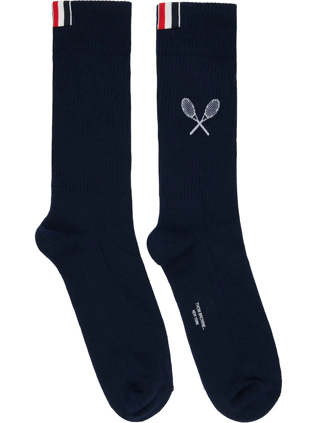 Pair of calf-high knit stretch cotton-blend socks. · Intarsia graphic at face · Signature tricolor grosgrain flag at rib-knit cuffs · Logo stamp at sole Supplier color: Navy 83% cotton, 16% polyamide, 1% elastane. Made in Italy 261381F076016