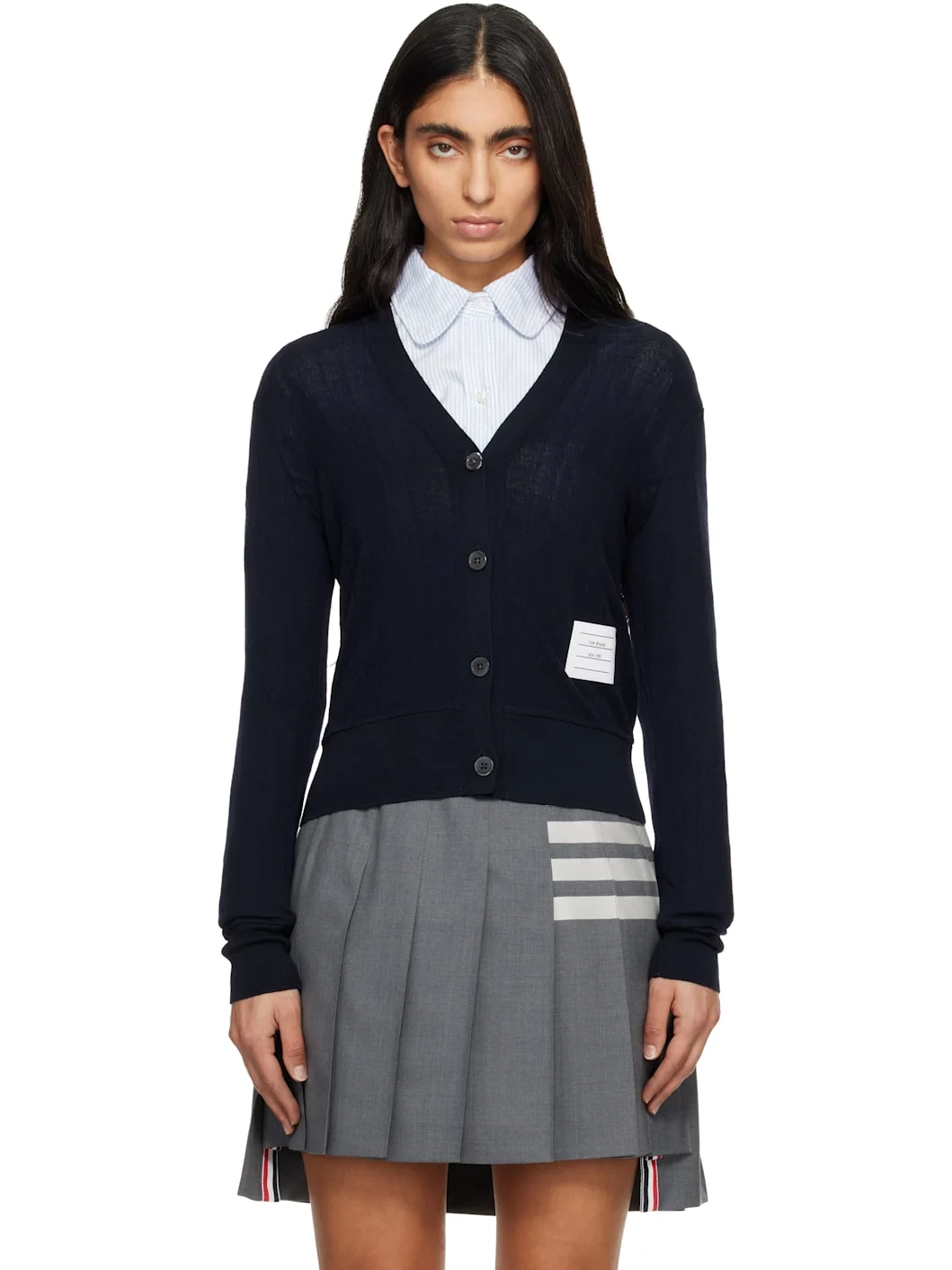 Rib-knit virgin wool cardigan. · Rib-knit Y-neck, hem, and cuffs · Button closure · Jacron logo patch at front hem · Grosgrain loop at back collar Supplier color: Navy 100% virgin wool. Made in Italy 261381F095000