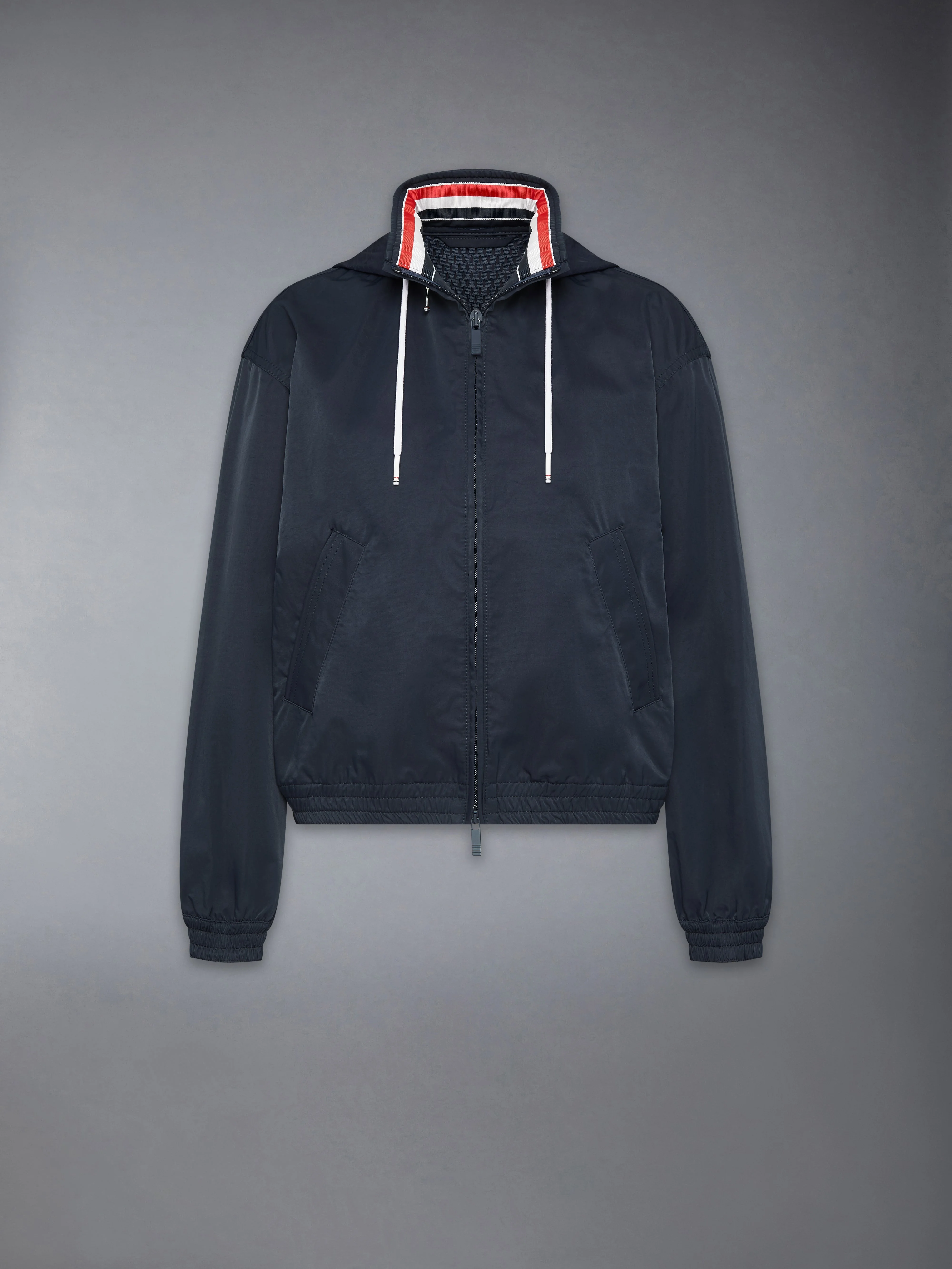 Crafted in a lightweight nylon–cotton tech, this track jacket reimagines technical outerwear through a refined, sport-influenced lens. A packable ripstop hood concealed within the collar underscores its engineered versatility, while the RWB stripe across the back nods to vintage sport sets that inspire the season’s playful mix of nostalgia and function. Front hidden two-way zip closure Stand collar lined with RWB grosgrain Ripstop drawstring hood that folds into collar with hidden zip Welt hand pockets with hidden snap Back storm flap over mesh panel RWB grosgrain trim along storm flap and back sleeves Elasticated cuffs and hem with channel stitching Signature striped grosgrain loop tab Model is 5'10" (178 cm), wearing size 40 51% Polyamide, 49% Cotton Made in Italy FBC963U-F1066-415