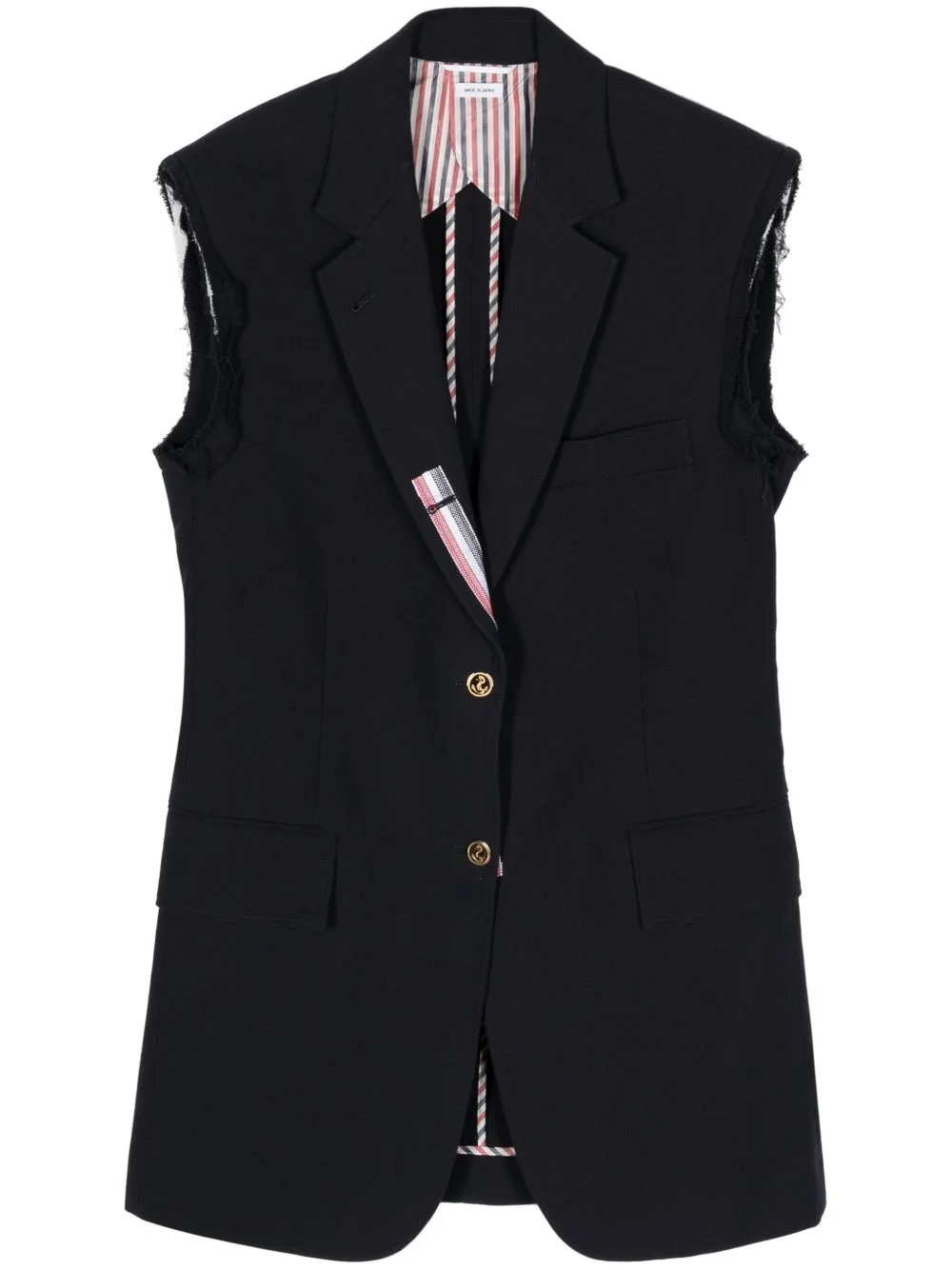 single-breasted waistcoat Highlights - Navy blue - Cotton blend - Notched lapels - Front button fastening - Jetted chest pocket - Two side flap pockets - Sleeveless - English rear vents - Straight hem Imported Composition Cupro 100%, Cotton 98%, Polyamide 2%