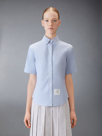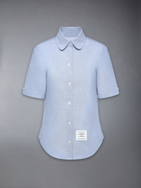 Effortless style meets sophistication with this classic Round Collar Oxford Short Sleeve Shirt, featuring signature Thom Browne emblems throughout. Pair it with one of our signature trousers. Front button closure Front patch pocket Name tag applique above hem Pleated back yoke with locker loop Signature striped grosgrain loop tab Model is 5'10" (178 cm), wearing size 40 100% Cotton Made in ITALY FLL206A-F0313-480