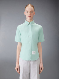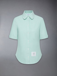 Effortless style meets sophistication with this classic Round Collar Oxford Short Sleeve Shirt, featuring signature Thom Browne emblems throughout. Pair it with one of our signature trousers. Front button closure Front patch pocket Name tag applique above hem Pleated back yoke with locker loop Signature striped grosgrain loop tab Model is 5'10" (178 cm), wearing size 40 100% Cotton Made in ITALY FLL206A-02188-350