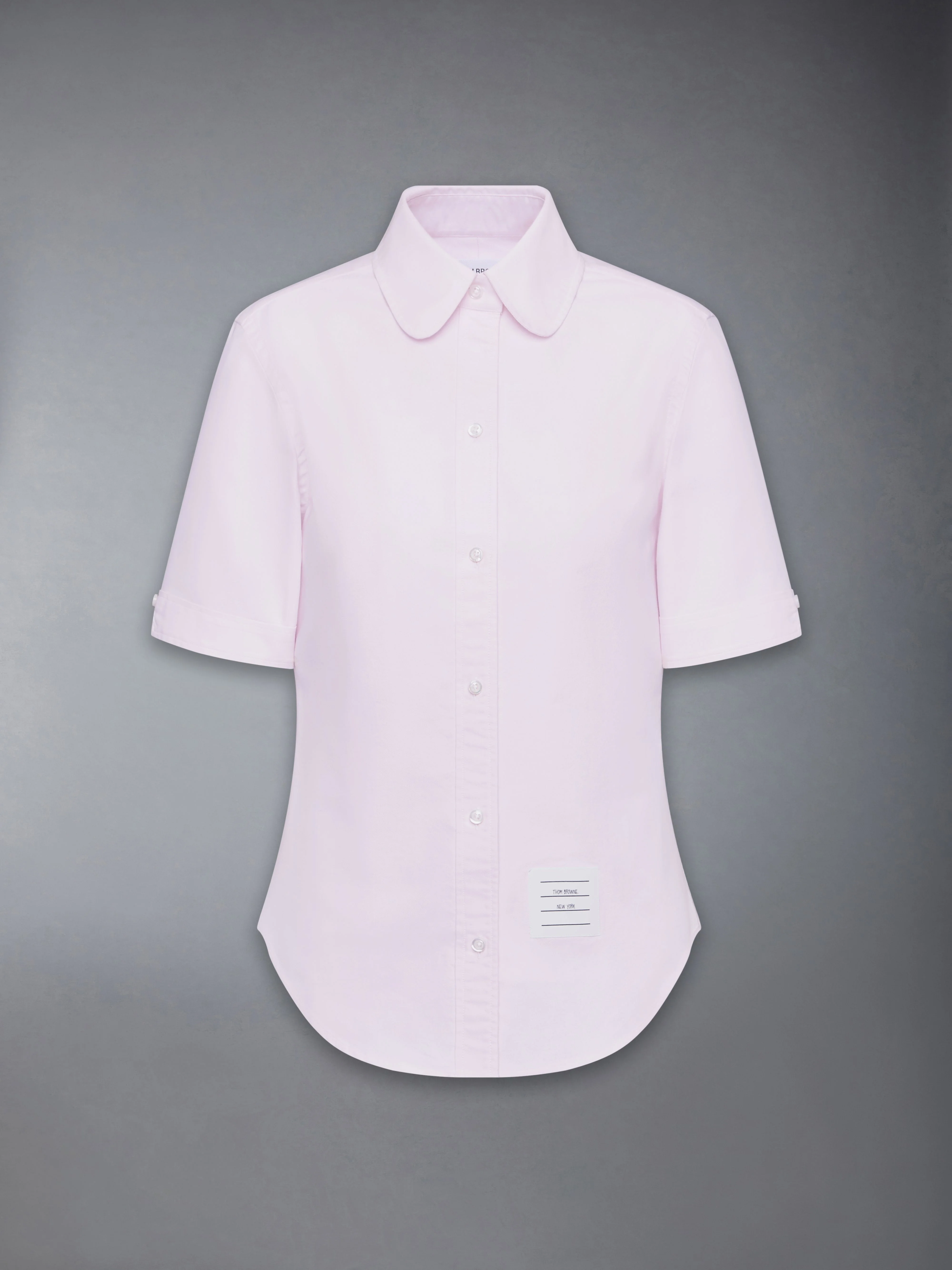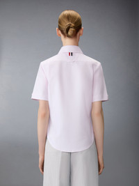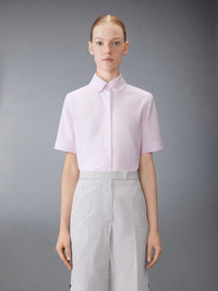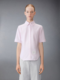 Effortless style meets sophistication with this classic Round Collar Oxford Short Sleeve Shirt, featuring signature Thom Browne emblems throughout. Pair it with one of our signature trousers. Front button closure Front patch pocket Name tag applique above hem Pleated back yoke with locker loop Signature striped grosgrain loop tab Model is 5'10" (178 cm), wearing size 40 100% Cotton Made in ITALY FLL206A-F0313-680