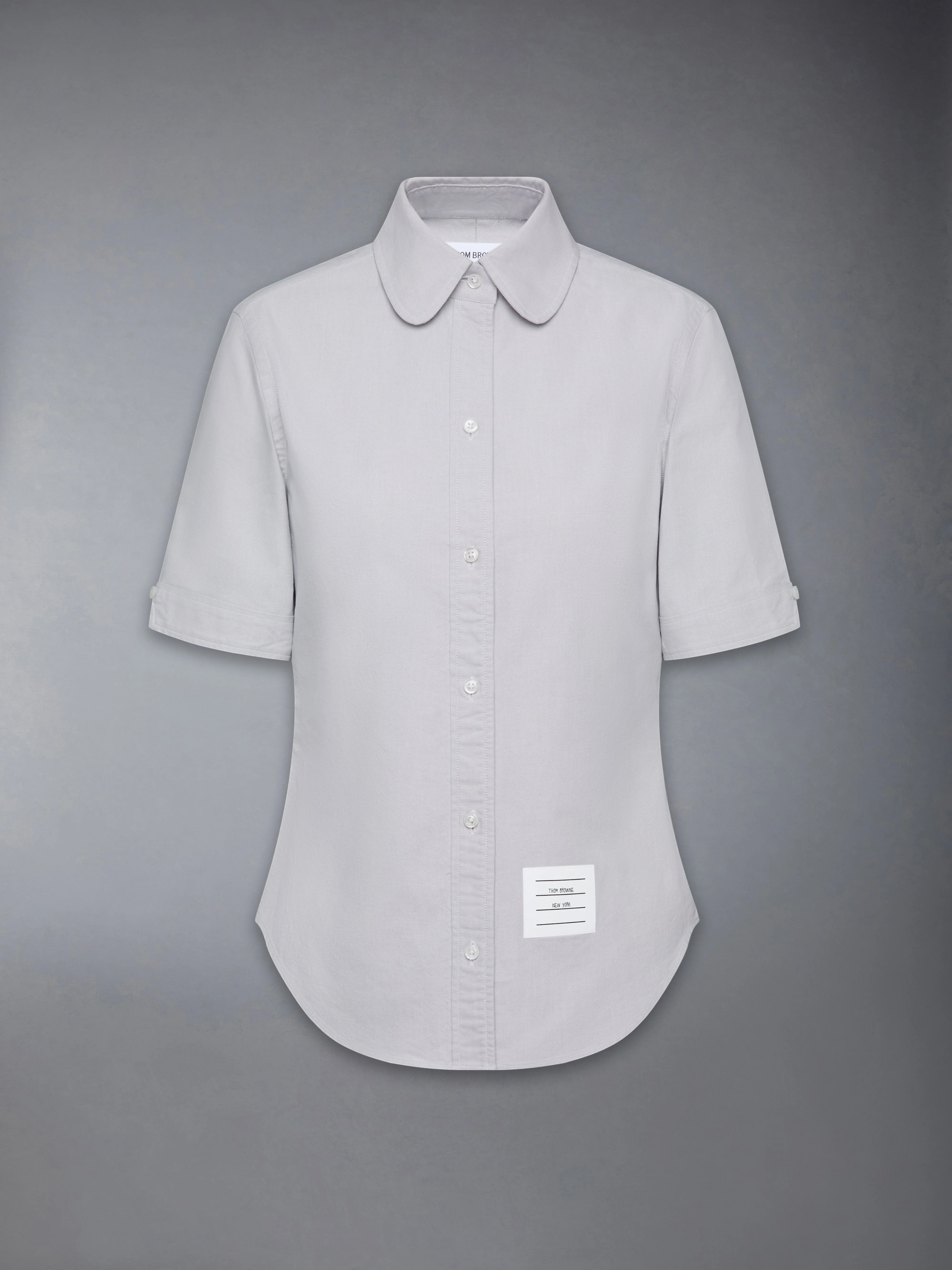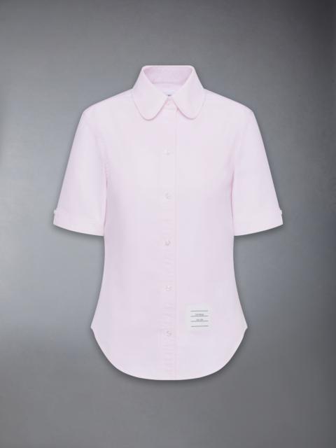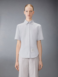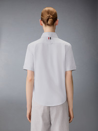 Effortless style meets sophistication with this classic Round Collar Oxford Short Sleeve Shirt, featuring signature Thom Browne emblems throughout. Pair it with one of our signature trousers. Front button closure Front patch pocket Name tag applique above hem Pleated back yoke with locker loop Signature striped grosgrain loop tab Model is 5'10" (178 cm), wearing size 40 100% Cotton Made in ITALY FLL206A-F0313-035