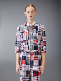 DETAILS & FIT Inspired by the timeless spirit of Americana, our Patchwork Bow Jacket features an enchanting bow at the neck and a one-of-a-kind pattern where signature Thom Browne hues are woven into intricate patchwork using seven different madras fabrics. This playful pattern adds a modern twist to a sophisticated silhouette, embodying the spirit of classic American style with a distinct Thom Browne flair. Pairs perfectly with our Patchwork High Waisted Trouser. Front hook eye closure 2 Front slip pockets Signature striped grosgrain loop tab Model is 5'10" (178 cm), wearing size 40 100% Cotton Lining: 100% Cotton Lining 2: 100% Cupro Made in Italy FBC924E-E1218-960