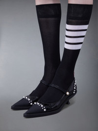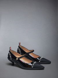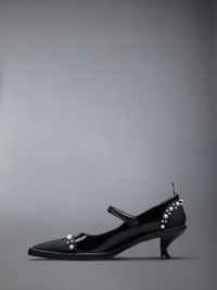 DETAILS & FIT Ornamented with lustrous pearls, this snappy evening shoe is perfect for holiday celebrations of any kind. Snap- button closure Pearl detailing Tonal leather sole 50mm leather curved heel Signature grosgrain loop tabs at heels Combo1: 100% Viscose Upper: 100% Calf Patent Leather Sole: 100% Calf Leather Lining: 100% Goat Leather Lining2: 100% Lamb Leather FFH283A-00216-001 - HEEL: 7.0cm - Sole height: 1.5cm