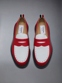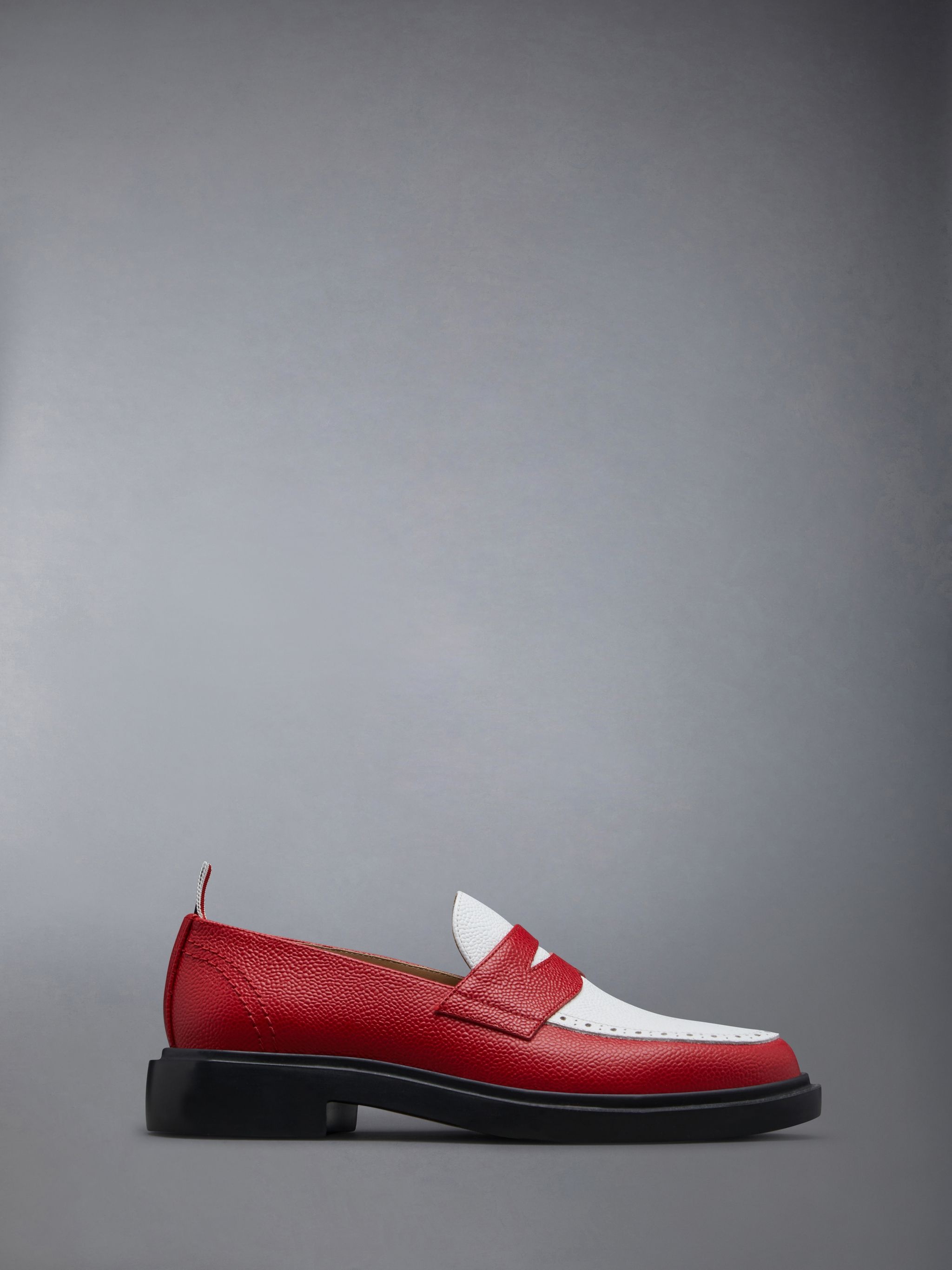 DETAILS & FIT Classic penny loafer in red and white pebble grain leather with black lightweight rubber sole. Apron toe with perforated detailing. Signature striped grosgrain loop tabs at heels. Upper: 100% Calf Leather Sole: 100% Rubber Lining: 100% Calf Leather Made in Italy FFF163A-06257-926 - HEEL: 3.0cm - WIDTH: 1.0cm