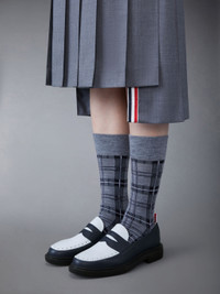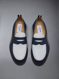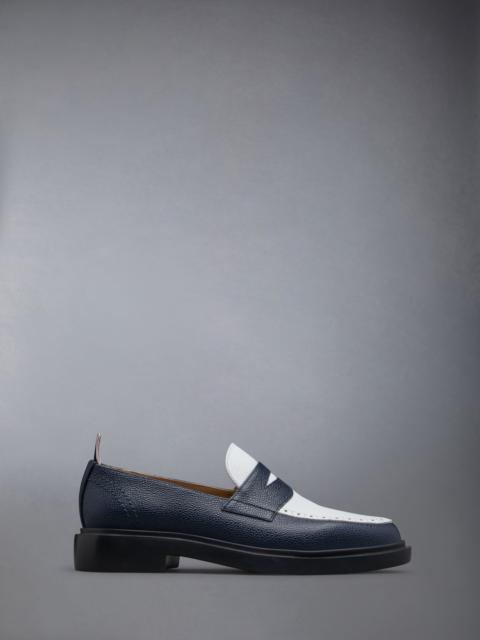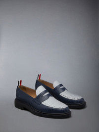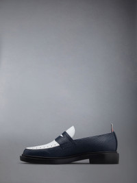 DETAILS & FIT Classic penny loafer in navy and white pebble grain leather with black lightweight rubber sole. Apron toe with perforated detailing. Signature striped grosgrain loop tabs at heels. Upper: 100% Calf Leather Sole: 100% Rubber Lining: 100% Calf Leather Made in Italy FFF163A-06257-927 - HEEL: 3.0cm - Sole height: 1.0cm