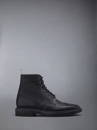 Crafted with the highest quality of classic shoemaking, our Pebble Grain Wingtip Boot is a staple in Thom Browne's legacy. Features an elongated toe, lightweight rubber sole, and streamlined silhouette. Lace up closure at grommeted metal eyelets Perforated broguing throughout Tonal Lightweight rubber sole Leather insole and lining Signature striped grosgrain loop tabs at heels Model is 5' 10" (178cm), wearing size 40 Upper: 100% Calf Leather Sole: 100% Rubber Lining: 100% Calf Leather Made in Italy FFB018B-00198-001