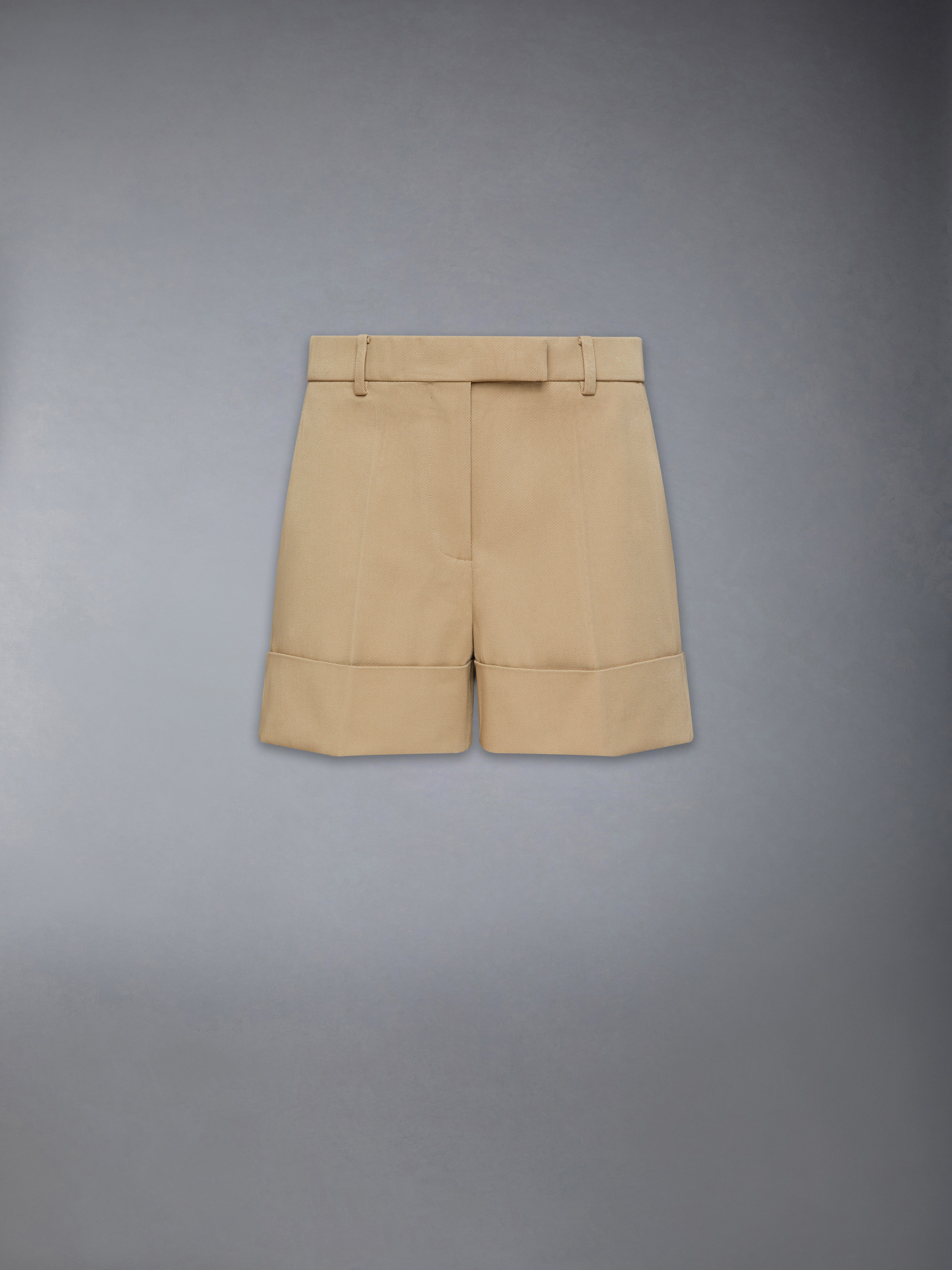 Beltloop sack shorts in piece-dyed camel cotton gabardine. Tab closure, flat front, creased legs, wide cuffs. Slant side pockets, button-fastening back welt pockets. Signature striped grosgrain loop tab at back waist. Sack - Fit 2. Model is 5'10" (178 cm), wearing size 40 100% Cotton Made in Italy FTC463U-F0175-250
