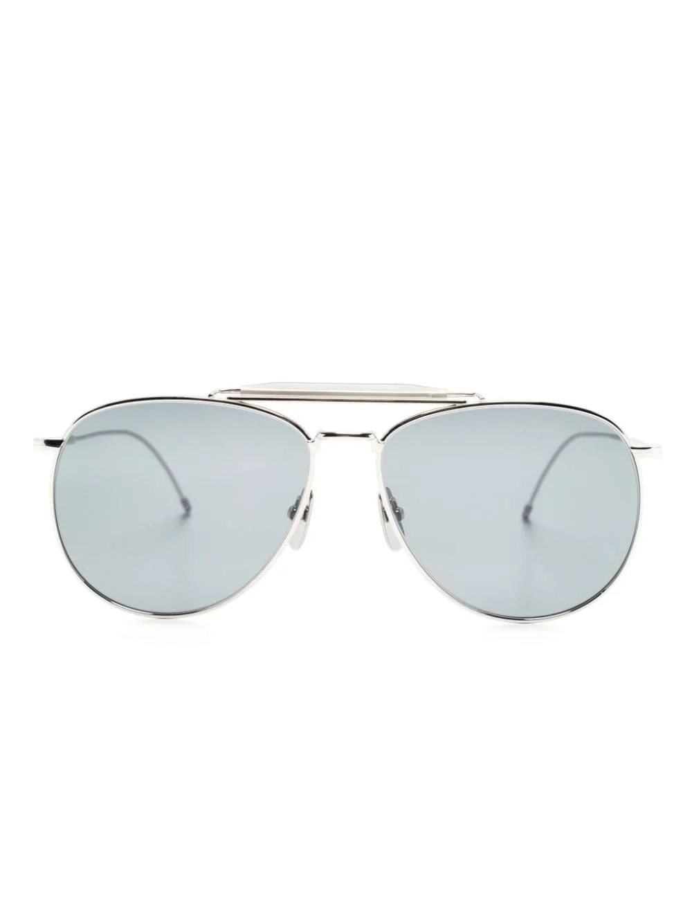 pilot-frame sunglasses Highlights - Silver-tone - Titanium/acetate - Pilot frame - Grey tinted lenses - Uv-protective lenses - Double bridge - Nose pads - Logo print at the arm - Straight arms - Curved tips - These glasses come with a protective case. Imported Composition Titanium 90%, Acetate 10% SIZE & FIT Measurement Arm Length 5.66 in(14.4 cm) Bridge Width 0.59 in(1.5 cm) Lens Diameter 2.44 in(6.2 cm) Total Width 5.7 in(14.5 cm)